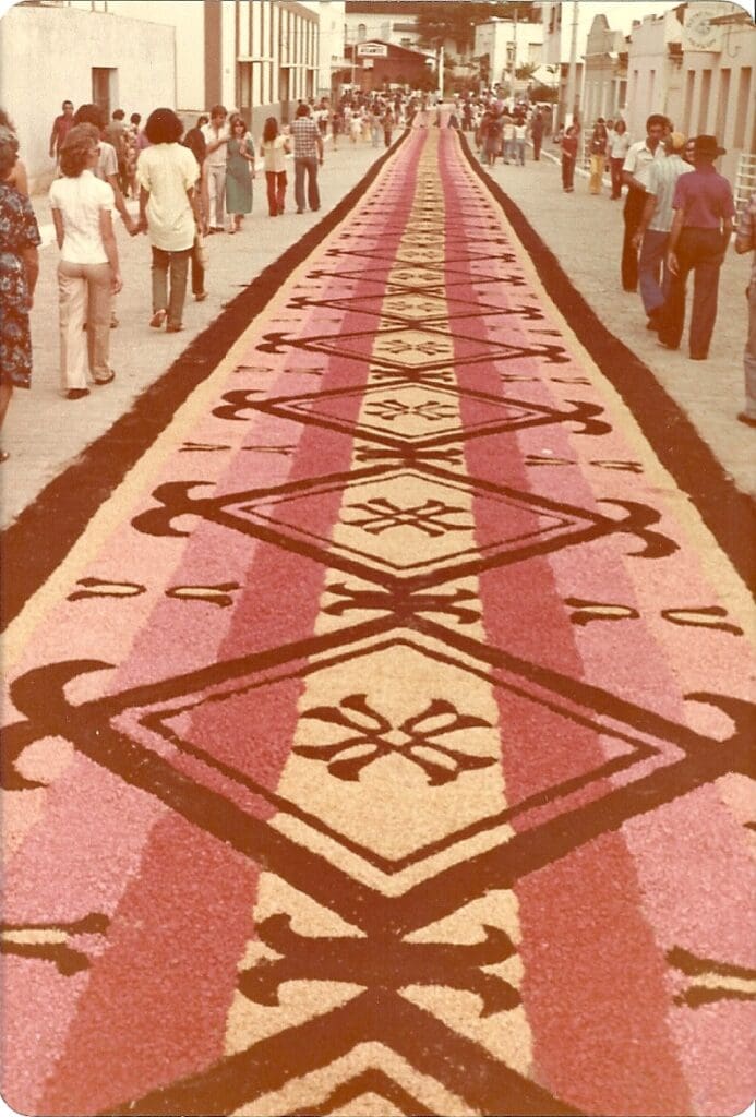 Antes das ruas serem asfaltadas, o piso era de paralelepípedos. A prefeitura preparava a rua com uma base de areia, antes da confecção dos tapetes. “Lembro-me que, quando chovia, os voluntários precisavam enxugar o asfalto com rodos e usavam panos antes de iniciar a produção”, lembrou.