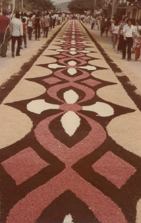 Antes das ruas serem asfaltadas, o piso era de paralelepípedos. A prefeitura preparava a rua com uma base de areia, antes da confecção dos tapetes. “Lembro-me que, quando chovia, os voluntários precisavam enxugar o asfalto com rodos e usavam panos antes de iniciar a produção”, lembrou.