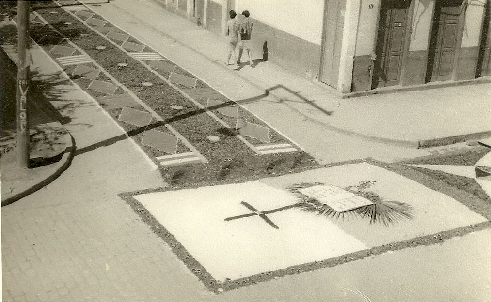 A religiosa foi responsável pela confecção do primeiro quadro, há 61 anos, feito em frente à Capela de Nossa Senhora das Graças, da Santa Casa de Castelo. E foi apenas um quadro feito com flores, folhas e pigmentos diversos de terra. “Este é o primeiro registro que encontramos dos tapetes. As passadeiras foram incluídas apenas no ano seguinte, em 1964”, contou Joelma.