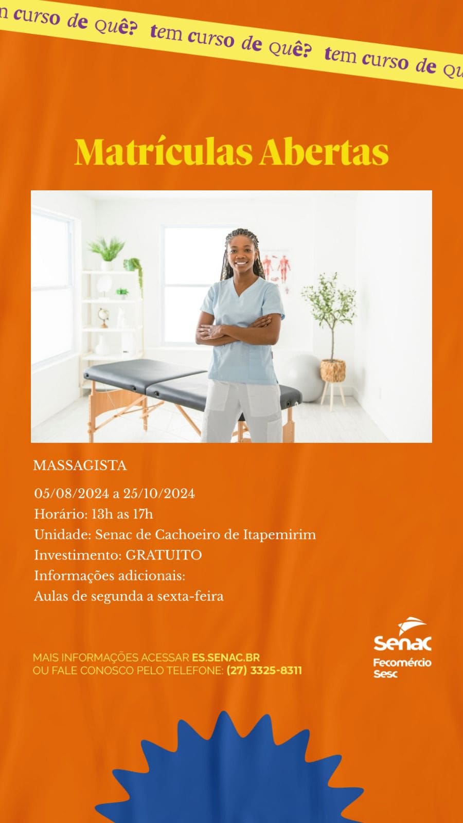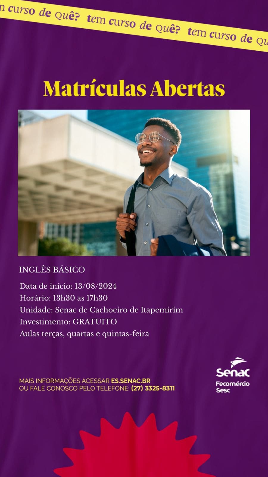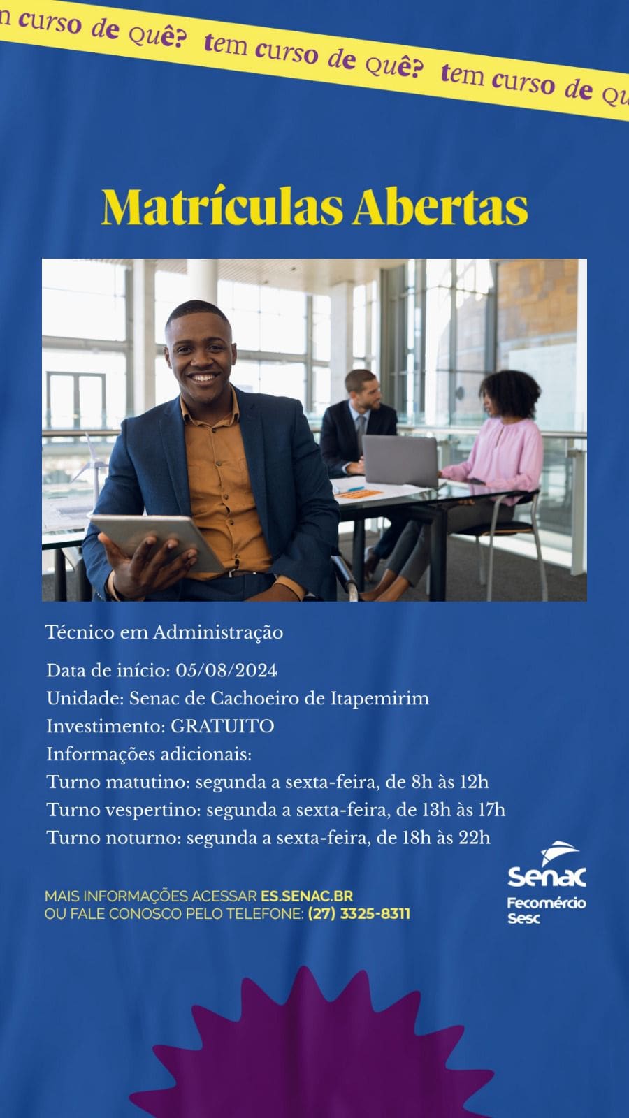 O Senac Espírito Santo, em parceria com a Federação do Comércio do Espírito Santo – Fecomercio, abriu 125 vagas gratuitas em vários cursos técnicos em Cachoeiro de Itapemirim. A oportunidade oferece formação técnica para alunos do 2ª ano do Ensino Médio Regular e Educação de Jovens e Adultos (EJA) da Rede Escolar Pública Estadual.