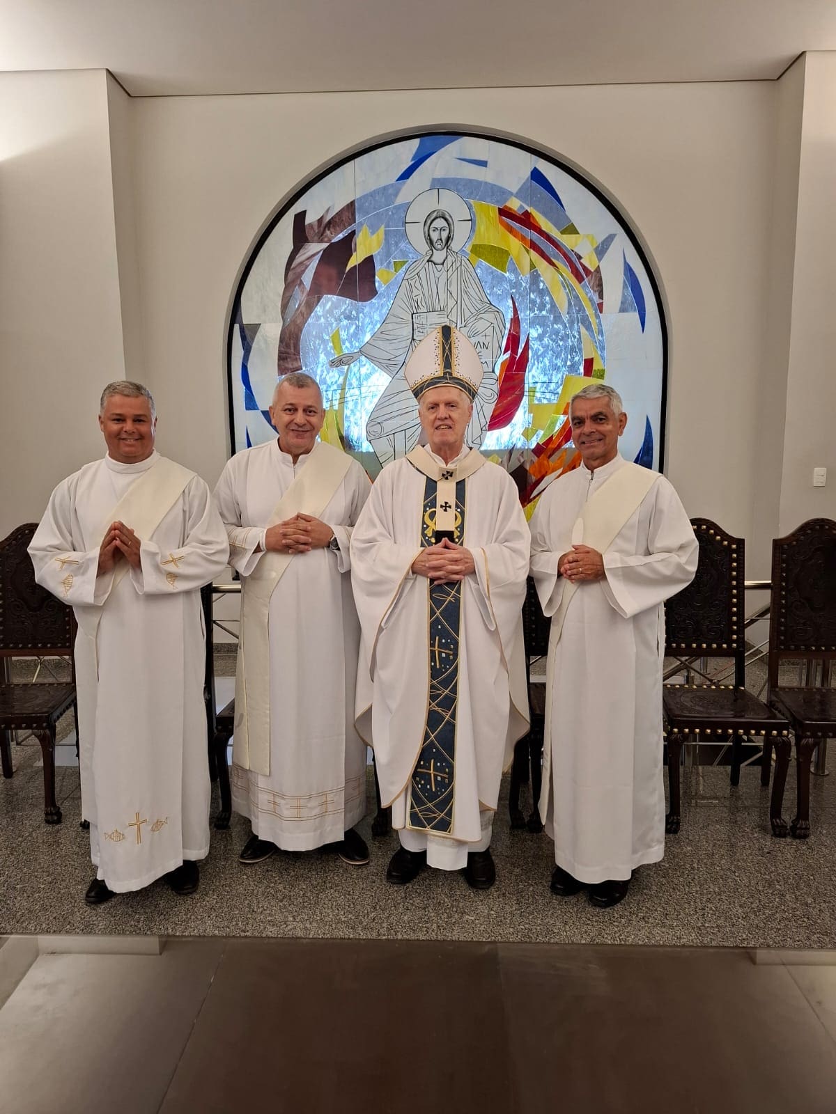 Diáconos da Diocese de Cachoeiro na Missa de Encerramento do 15º Simpósio das Famílias, em Aparecida, com Dom Orlando Brandes, Arcebispo da Arquidiocese de Aparecida (SP).