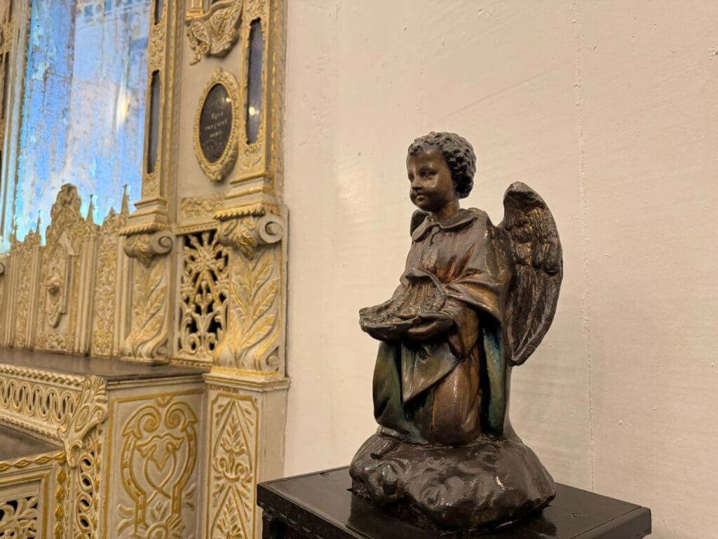 O tal “anjinho” é conhecido por aqui. Fica na lateral da Igreja Matriz Velha, com a cabeça presa numa molinha. Quando alguém coloca uma moeda, ele balança a cabeça — um aceno mecânico de gratidão. Nada demais, mas para Beatriz, aquilo era sério. Era como se o céu tivesse falhado.