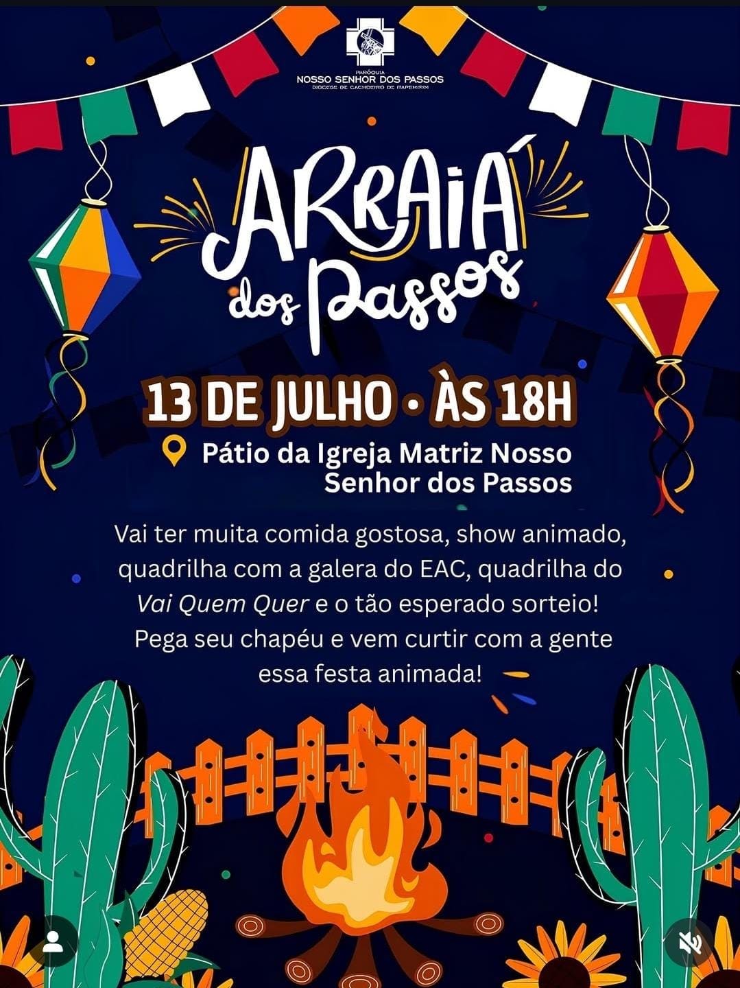 A Paróquia Nosso Senhor dos Passos (Matriz Velha), em Cachoeiro de Itapemirim, convida toda a comunidade para participar do animado “Arraiá dos Passos”, que acontecerá no próximo dia 13 de julho, a partir das 18h, no pátio da Igreja Matriz.