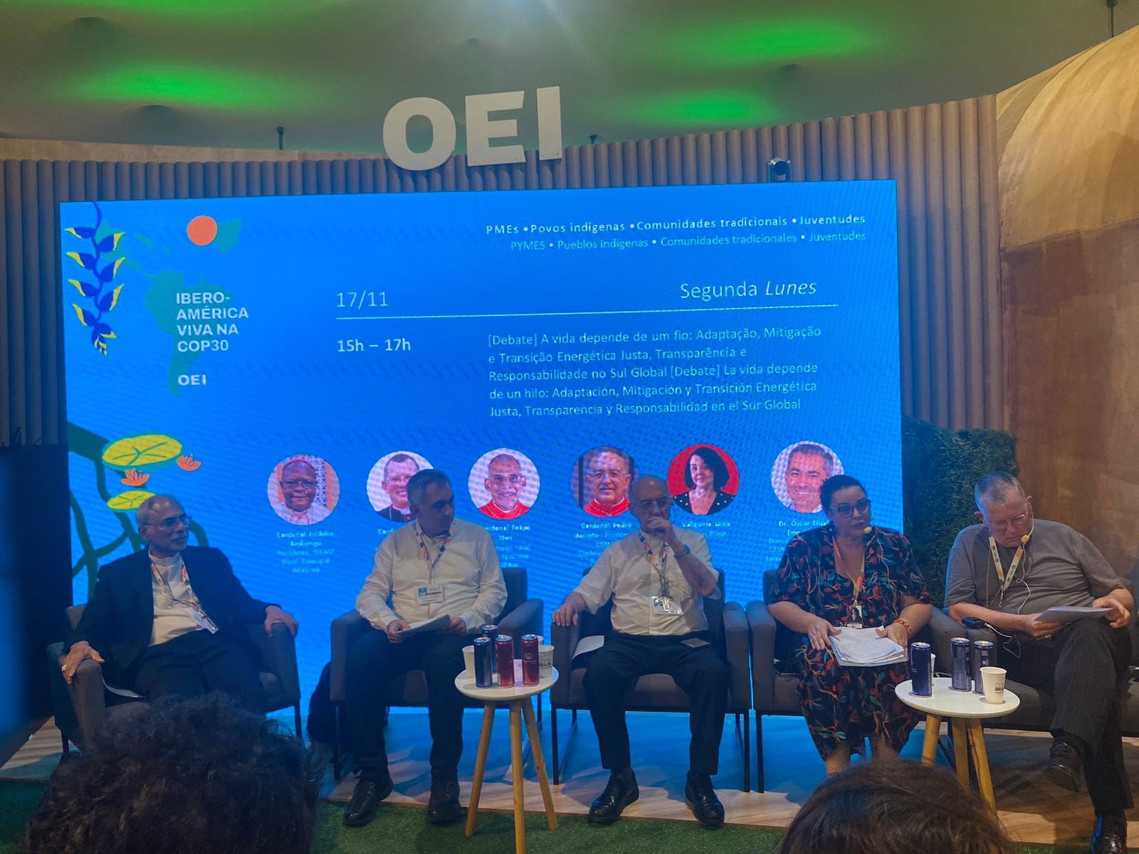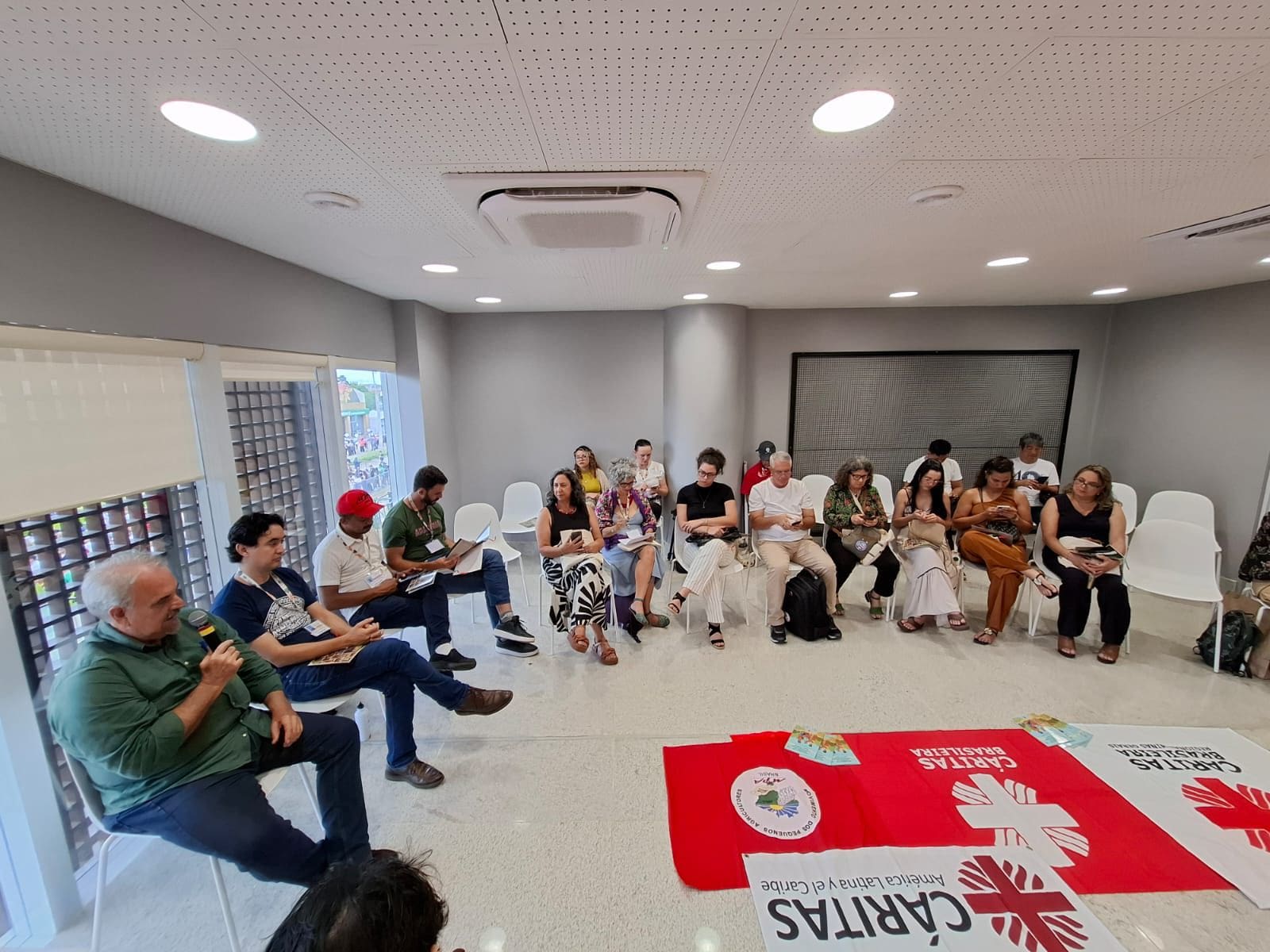 Logo no início da conversa com o radialista André Luiz de Matos, ficou evidente o entusiasmo dos três representantes. Ana Cláudia, a primeira a falar, descreveu o impacto da presença e atuação da Igreja Católica na conferência. “Nós fomos convidados pela Cáritas Brasileira, que já tinha espaços reservados na Zona Azul, na Zona Verde e também em áreas externas da COP. Mas o que vimos ali superou qualquer expectativa”, afirmou. “Encontramos cardeais, religiosas, padres de vários países, todos profundamente envolvidos com as questões climáticas. Era realmente a Igreja em saída de que fala o Papa Francisco. A Igreja estava presente, ativa e com propriedade nos debates.”