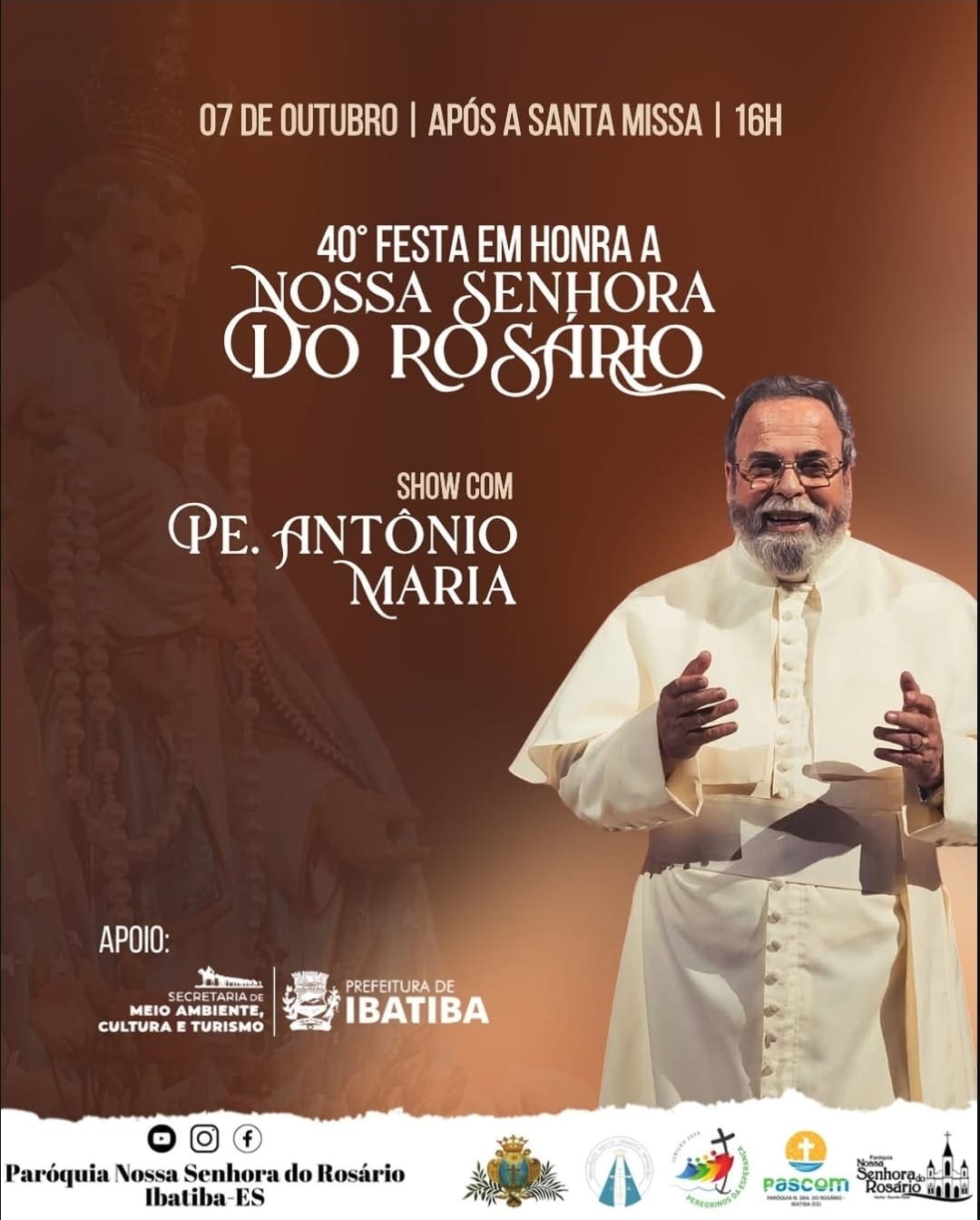 A expectativa cresce para o 07 de outubro, quando será celebrada a Santa Missa Solene da Padroeira, presidida pelo Arcebispo-Bispo da Diocese de Cachoeiro de Itapemirim, Dom Luiz Fernando Lisboa, C.P.. Logo após a celebração, a programação contará com um dos momentos mais esperados desta edição: o show nacional do Padre Antônio Maria, referência no Brasil pela sua missão evangelizadora e pelas canções que tocam o coração do povo.