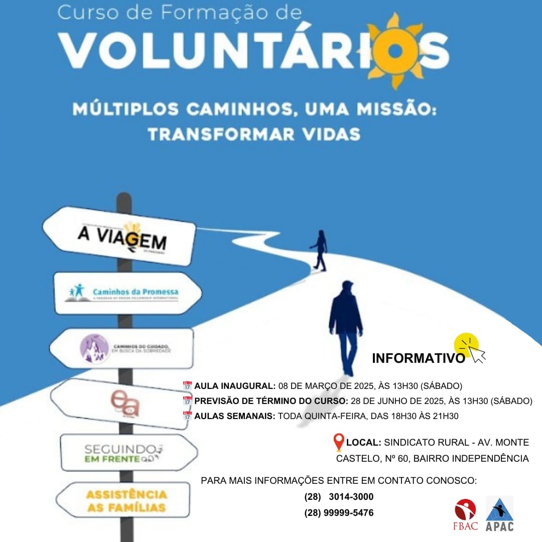 A APAC de Cachoeiro abriu inscrições para o Curso de Formação de Voluntários 2025, com o tema “Múltiplos Caminhos, Uma Missão: Transformar Vidas”. O curso tem uma carga horária de 60 horas com 15 encontros presenciais, sendo o primeiro, terceiro e último encontro aos sábados no período de 14:00 h às 17:00 h e os demais encontros nas quinta-feira no período de 18:30 h às 21:30 h. O curso terá início no dia 08 de março de 2025 e acontecerá no Sindicato Rural de Cachoeiro de Itapemirim (Rua Agripino Oliveira, 60, Independência, Cachoeiro de Itapemirim, ES – CEP: 29.306-450) – ao lado do Fórum de Cachoeiro. Este curso representa uma oportunidade única para pessoas comprometidas que desejam desempenhar um papel ativo na transformação da vida daqueles que buscam reintegração à sociedade. A qualificação é gratuita e dá direito a um certificado.