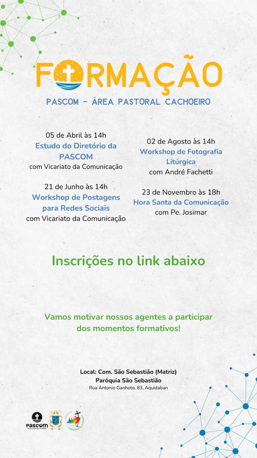 O aprofundamento teórico, fruto de uma parceria entre a Paróquia São Sebastião, no bairro Aquidaban e o Vicariato Episcopal para Comunicação da Diocese de Cachoeiro de Itapemirim, foi uma iniciativa da Área Pastoral Cachoeiro – agrupamento das paróquias presentes no perímetro urbano de Cachoeiro. A formação será no Salão paroquial, às 14 horas.