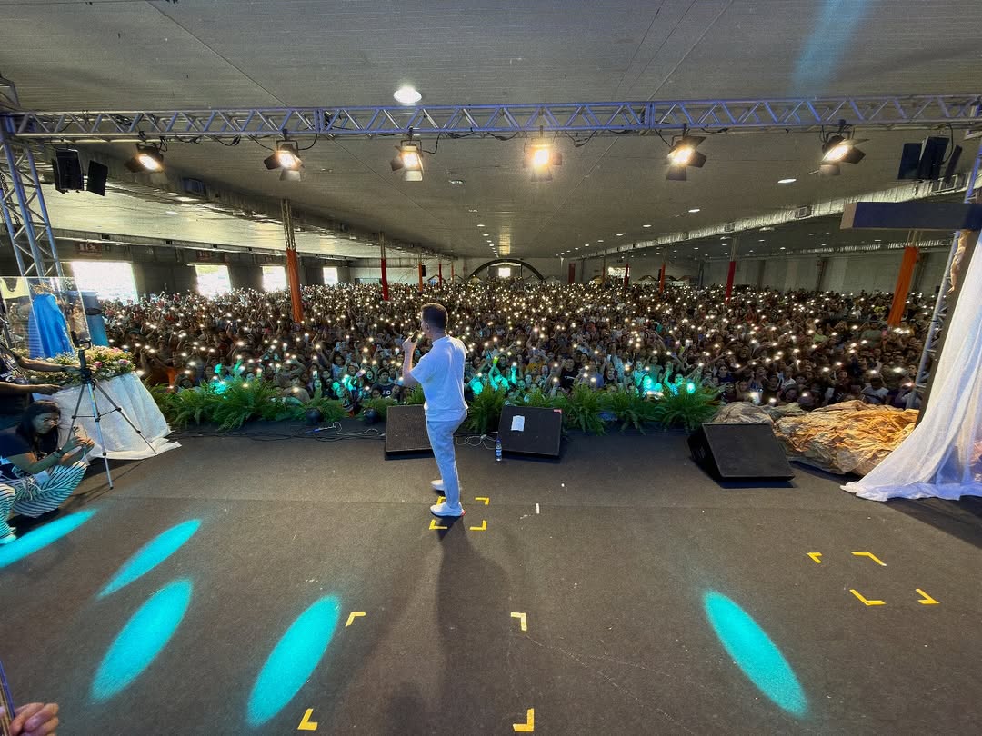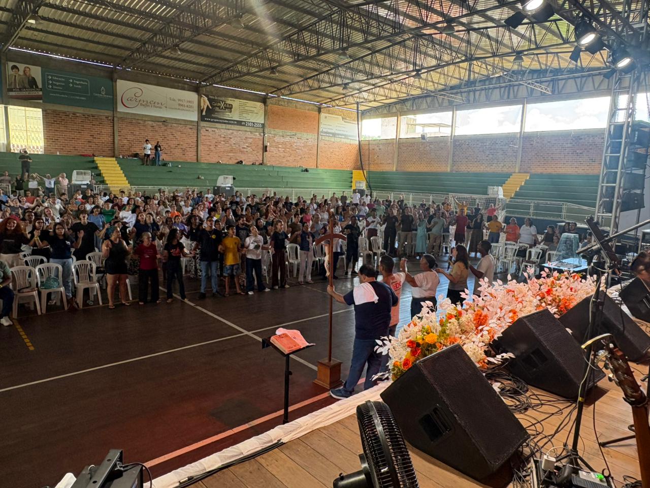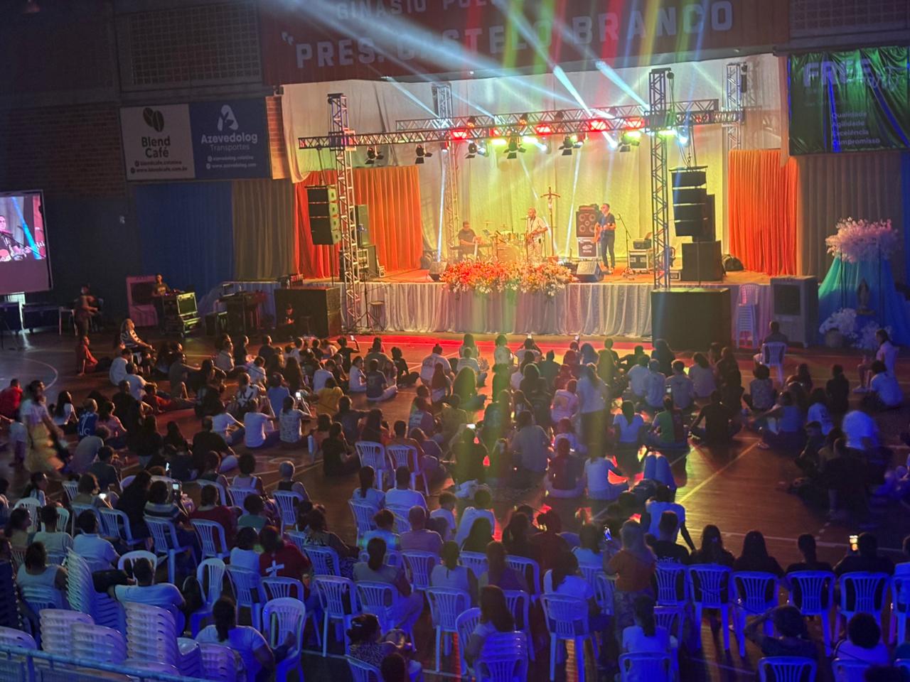 Fiéis reunidos no Pavilhão de Carapina durante momento de louvor e animação, marcando a 32ª edição do Vinde e Vede, que reuniu cerca de 7.500 participantes.