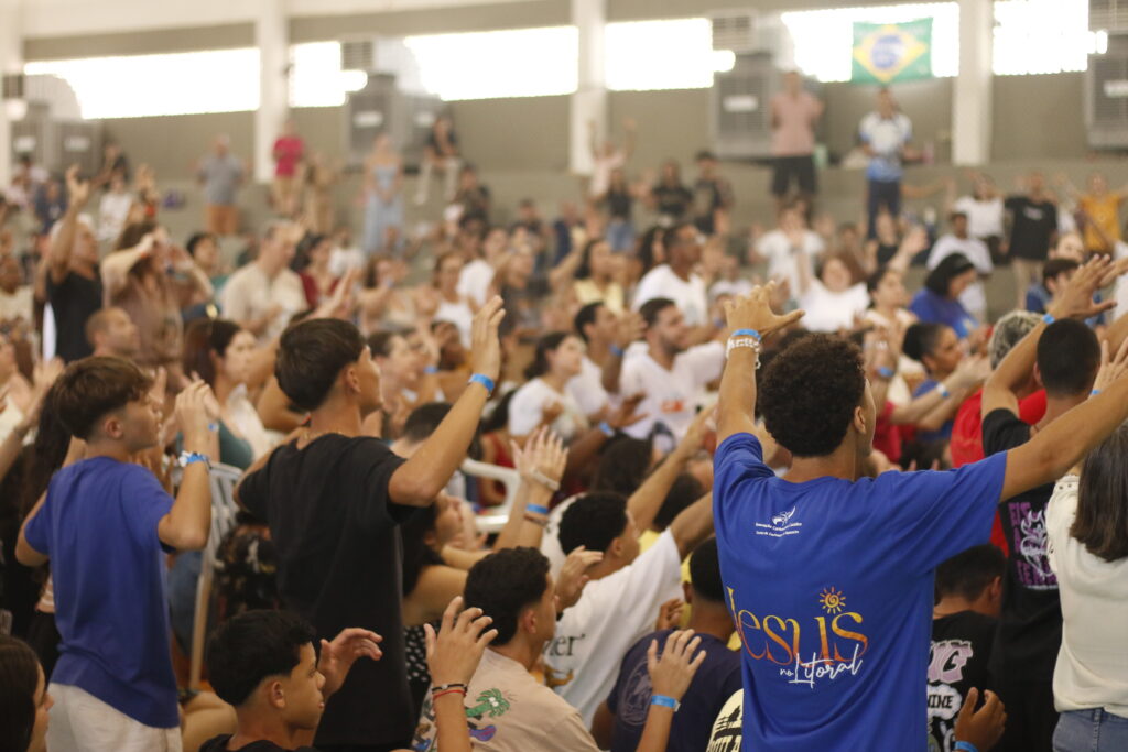 Fiéis reunidos no Pavilhão de Carapina durante momento de louvor e animação, marcando a 32ª edição do Vinde e Vede, que reuniu cerca de 7.500 participantes.