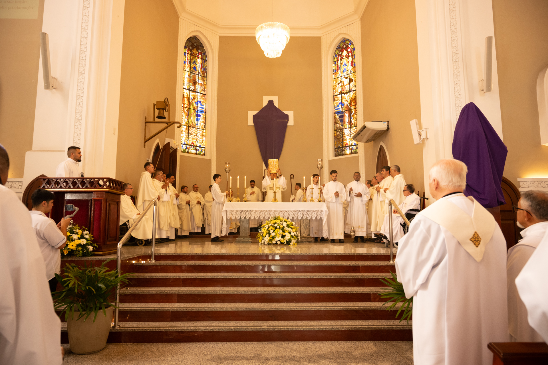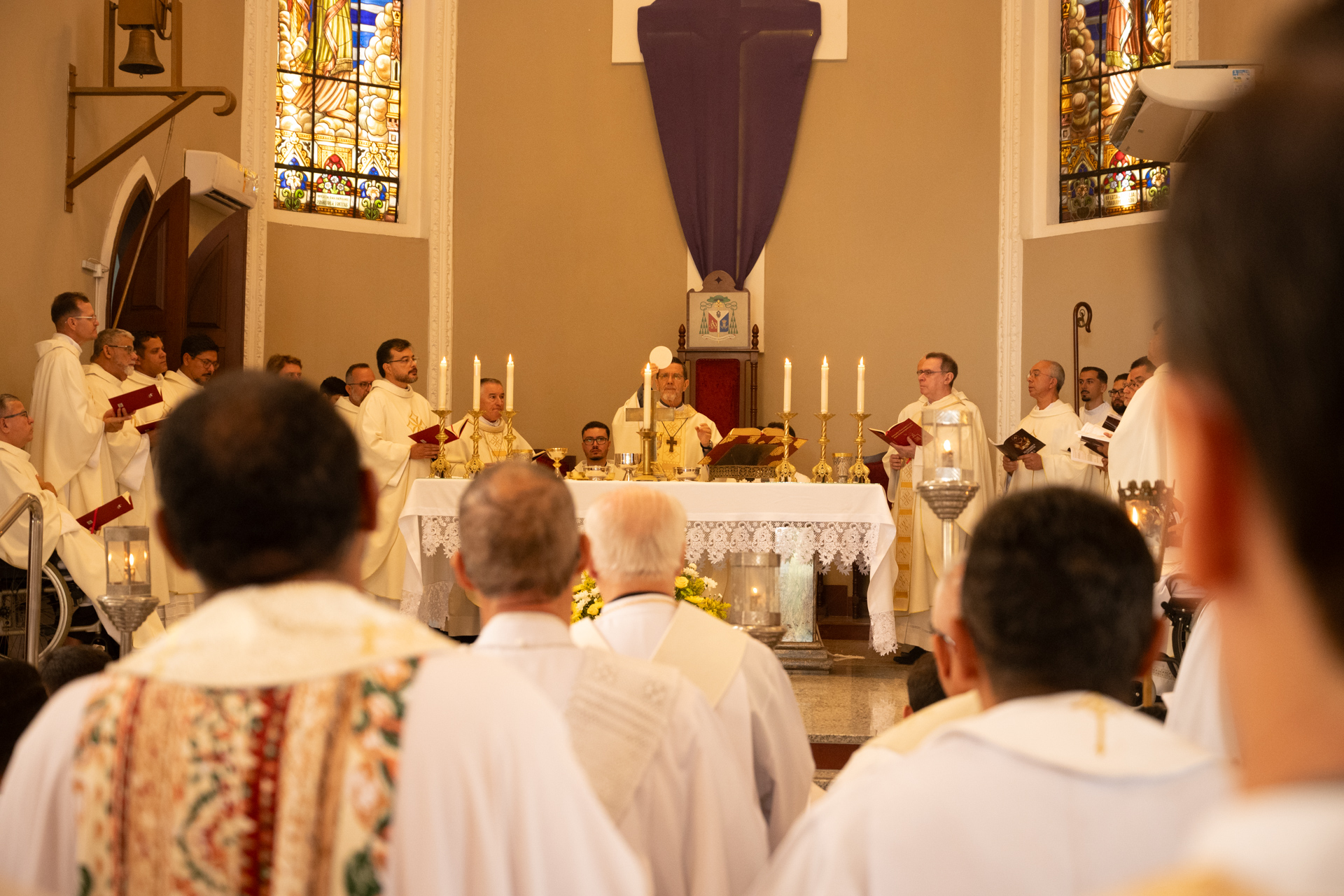 A celebração teve início por volta das 9h e foi presidida pelo bispo diocesano, Dom Luiz Fernando Lisboa, CP, contando também com a presença de Dom Tarcísio Scaramussa, SDB, bispo emérito de Santos (SP). A Missa do Crisma integra as celebrações centrais da Semana Santa e recorda de forma especial a instituição do ministério sacerdotal. A celebração também reúne todo o presbitério da diocese em torno do bispo, manifestando a unidade da Igreja.