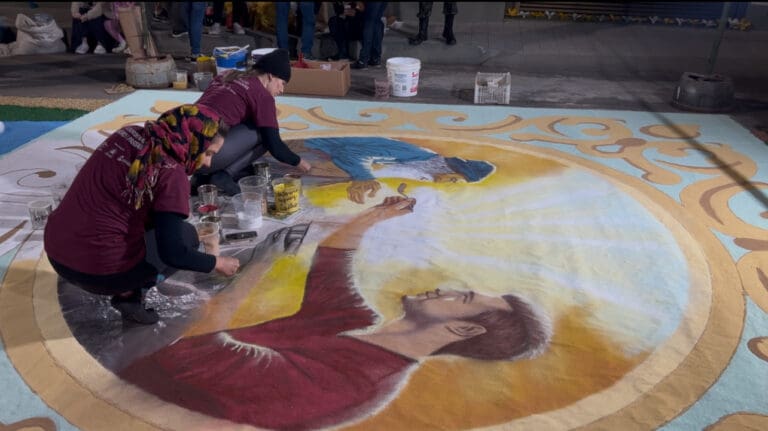 Voluntários enfrentam o frio para confeccionar os tapetes em Castelo