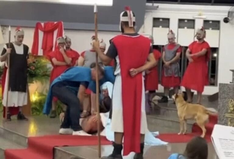 Cachorrinho Caramelo encanta fiéis durante encenação da Paixão de Cristo em Venda Nova do Imigrante