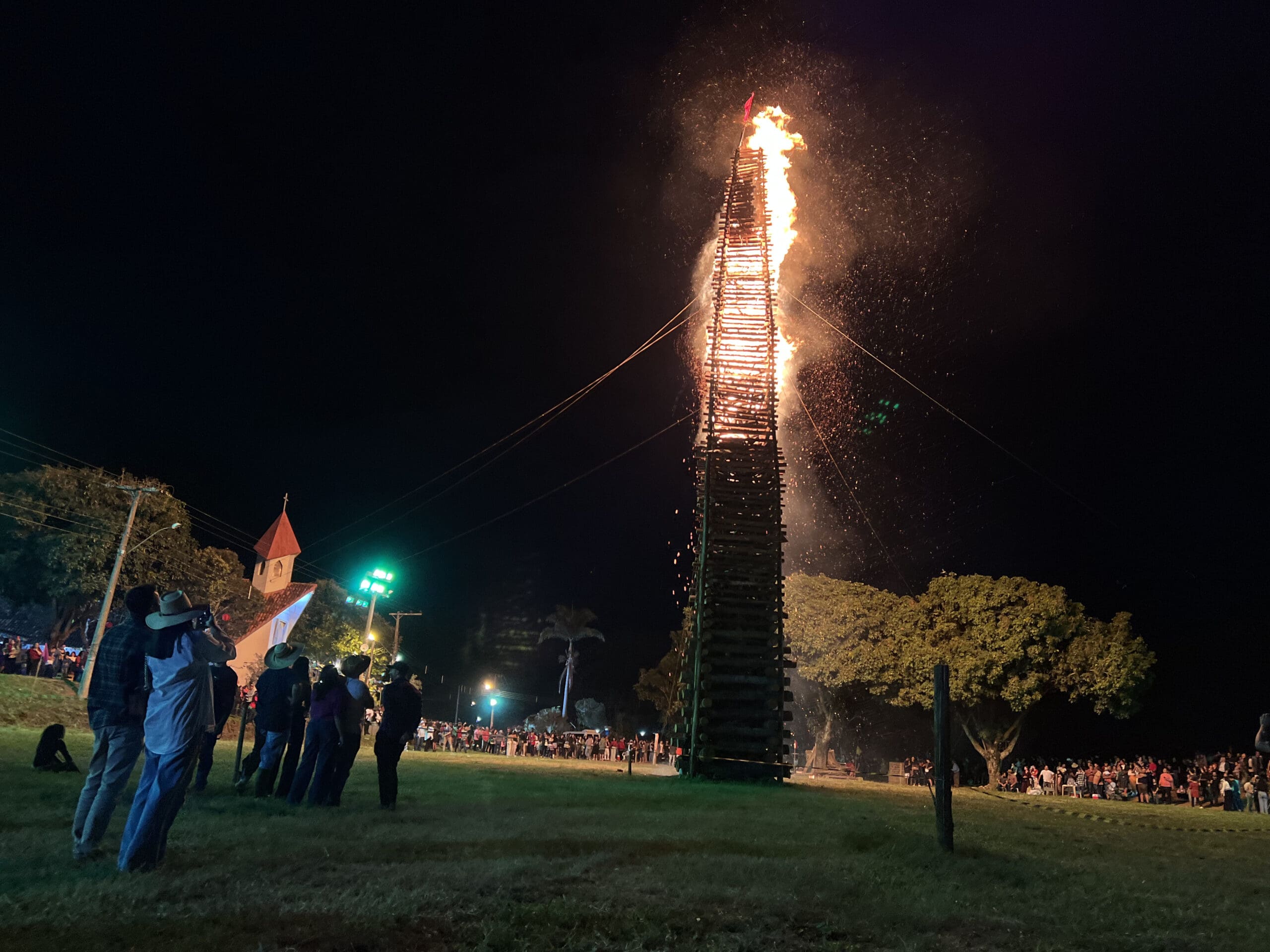 Queima de fogueira de 26 metros marca tradição há 11 anos em Festa de São João Batista, em Rio Novo do Sul