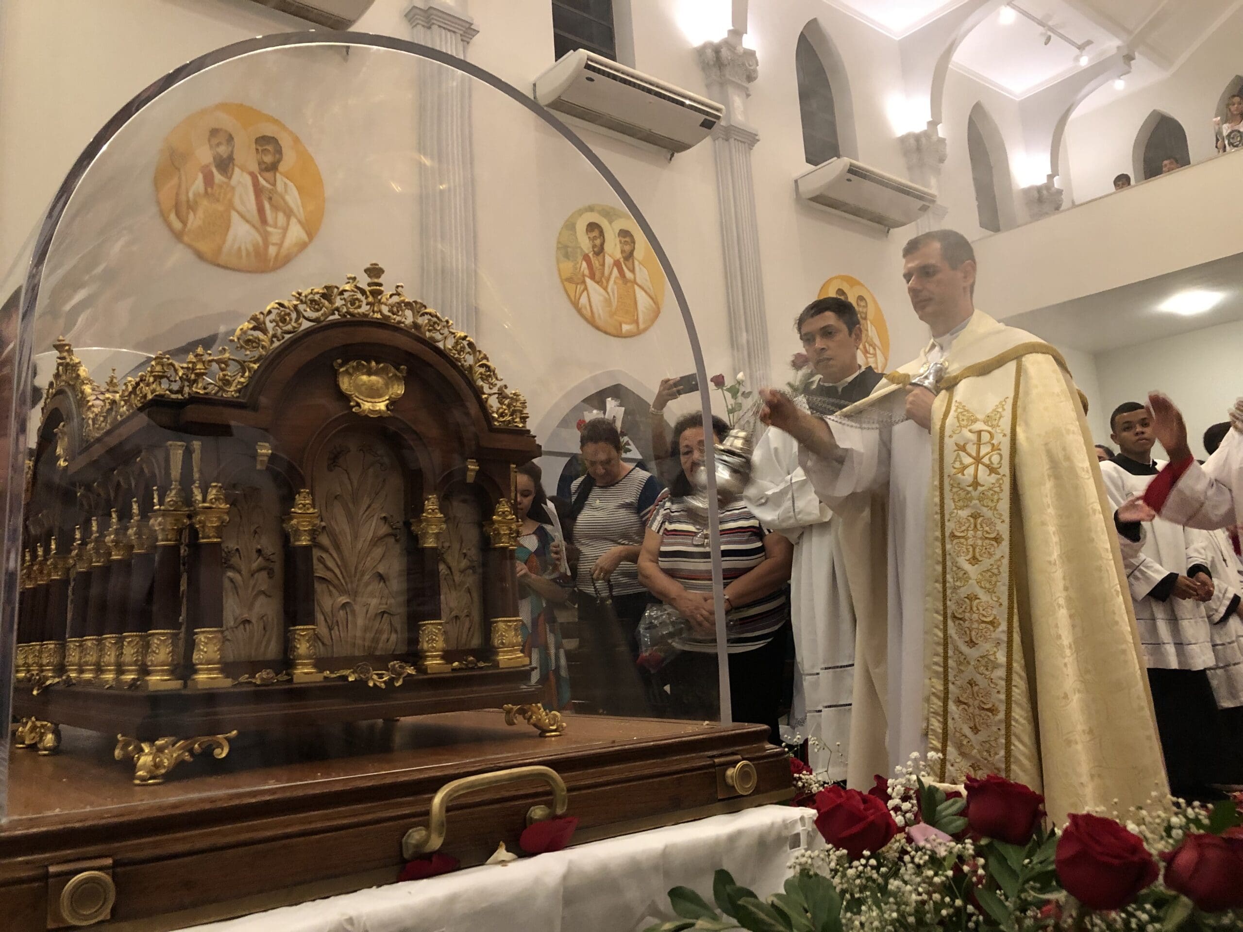 A arca de madeira ornada com adereços dourados, dentro da qual estão ossos do pé e do fêmur da santa, foi recebida na Matriz ao badalar dos sinos às 18h06. Pesando 135 quilos, o relicário enclausurado em uma urna de acrílico foi conduzido até o interior da igreja.