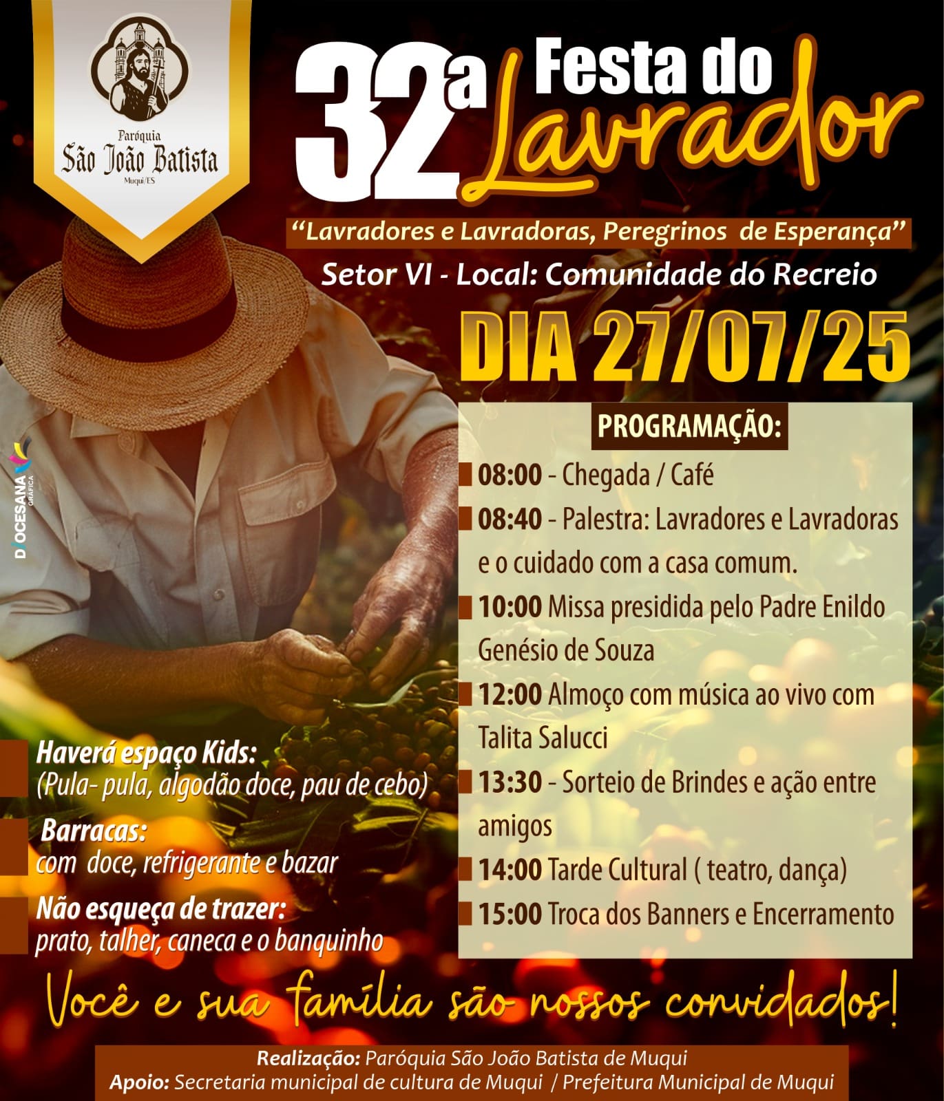 A Paróquia São João Batista, em Muqui, realiza no próximo dia 27 de julho, a tradicional Festa do Lavrador, que chega à sua 32ª edição. Com o tema “Lavradores e Lavradoras, Peregrinos de Esperança”, o evento acontece no Setor VI, na Comunidade do Recreio, e reunirá fiéis, famílias e agricultores em um dia de profunda espiritualidade, confraternização e valorização da cultura rural.