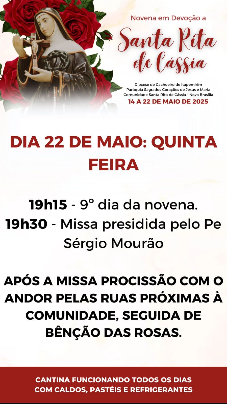 A Comunidade Santa Rita de Cássia localizada no bairro Nova Brasília, em Cachoeiro de Itapemirim, pertencente à Paróquia Sagrados Corações de Jesus e Maria e celebra nesta quinta-feira, 22 de maio, o dia de sua padroeira com uma grande festividade.