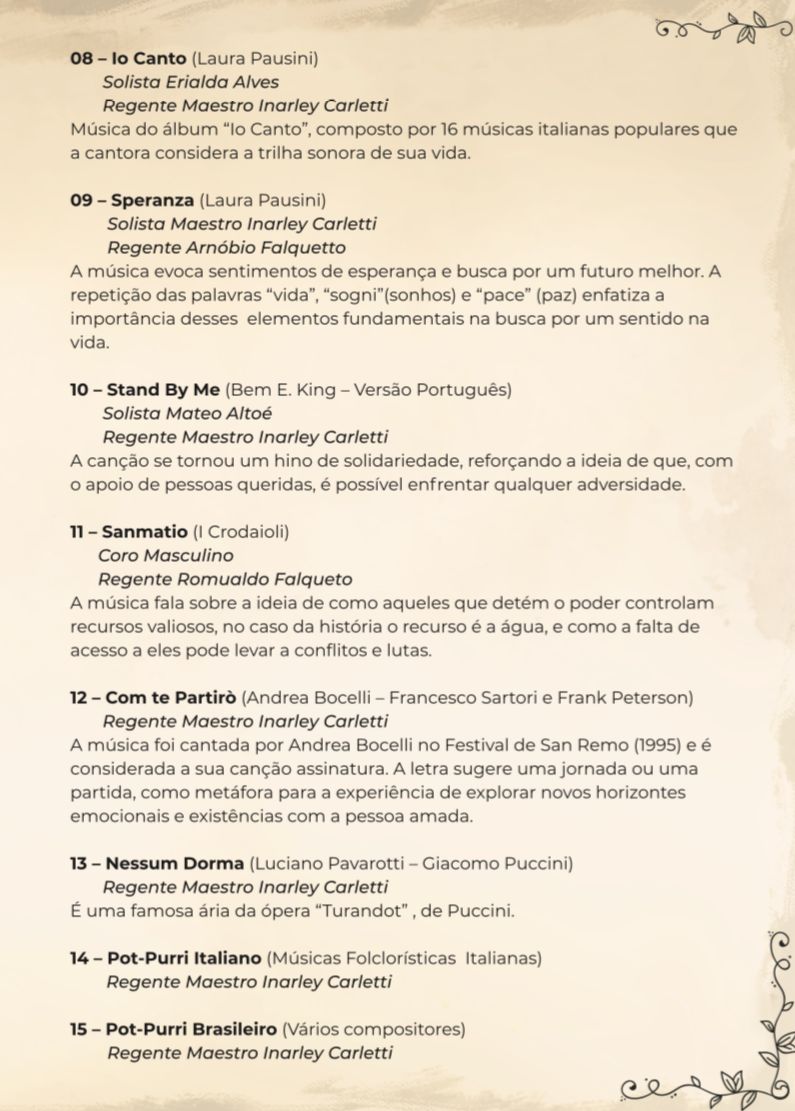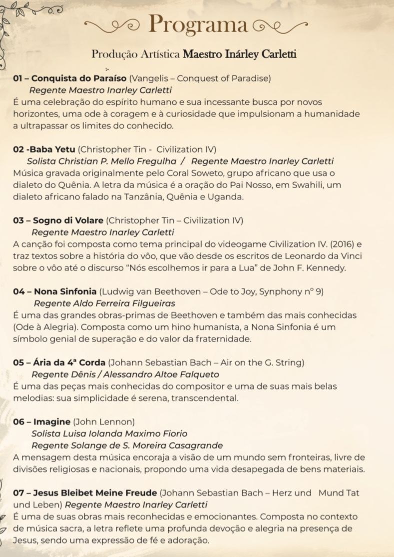 Quem está liderando essa missão é o maestro e produtor musical Inárley Carletti. “Vai ser uma grande surpresa. Ninguém imagina o que vai vivenciar ao comparecer ao espetáculo”. E, apesar de não poder revelar o que vai acontecer na noite de 12 de dezembro, Inárley adianta que o Coral vai apresentar um repertório completamente novo, que levará o público a viajar do clássico ao moderno. Queremos encantar de um modo geral e, principalmente, instigar o público jovem”