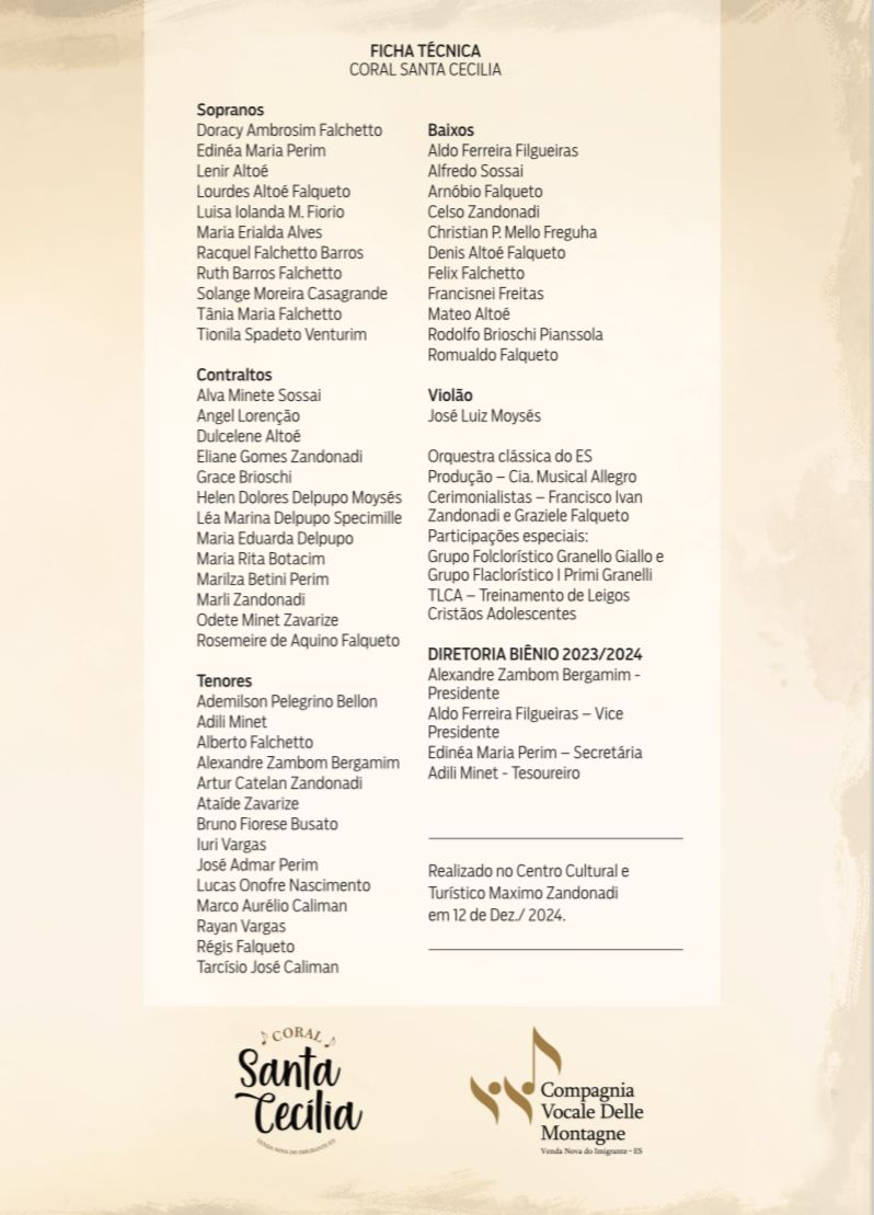 O Coral Santa Cecília, que está completando 80 anos de fundação, apresentara um repertorio hoje, dia 12 de dezembro, às 19 horas, no Centro Cultural e Turístico de Venda Nova do Imigrante (Vila Betânea).