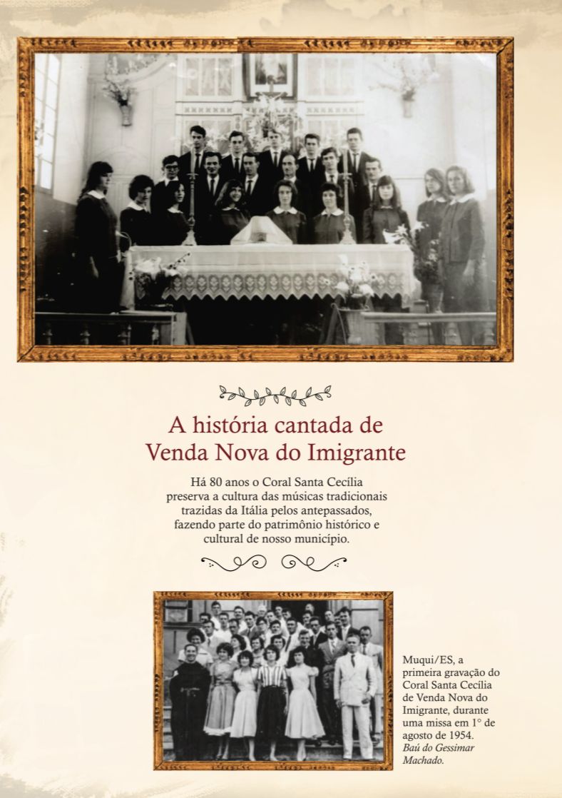 O Coral Santa Cecília, que está completando 80 anos de fundação, apresentara um repertorio hoje, dia 12 de dezembro, às 19 horas, no Centro Cultural e Turístico de Venda Nova do Imigrante (Vila Betânea).