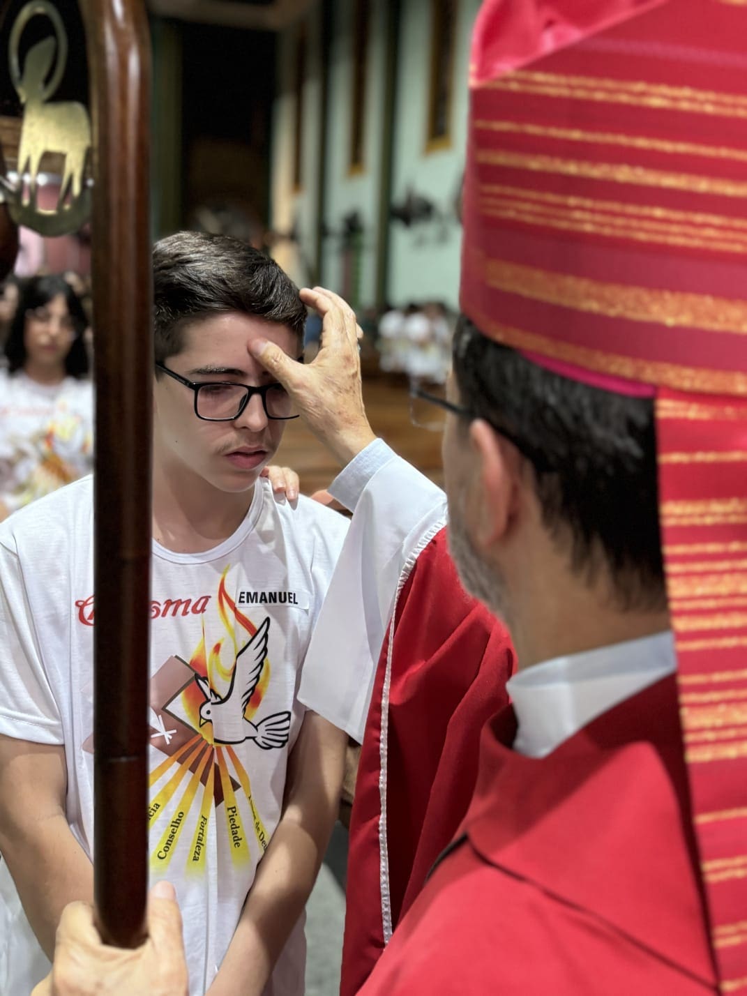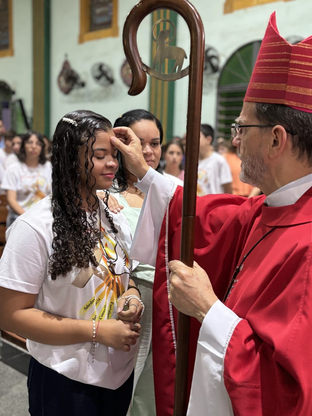 Após a homilia, os jovens e adultos renovaram as promessas batismais e receberam o sacramento da Confirmação, por meio da imposição das mãos e da Unção Crismal, gesto que simboliza o envio à missão e a plenitude do Espírito Santo na vida cristã.