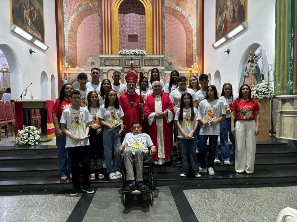 Após a homilia, os jovens e adultos renovaram as promessas batismais e receberam o sacramento da Confirmação, por meio da imposição das mãos e da Unção Crismal, gesto que simboliza o envio à missão e a plenitude do Espírito Santo na vida cristã.