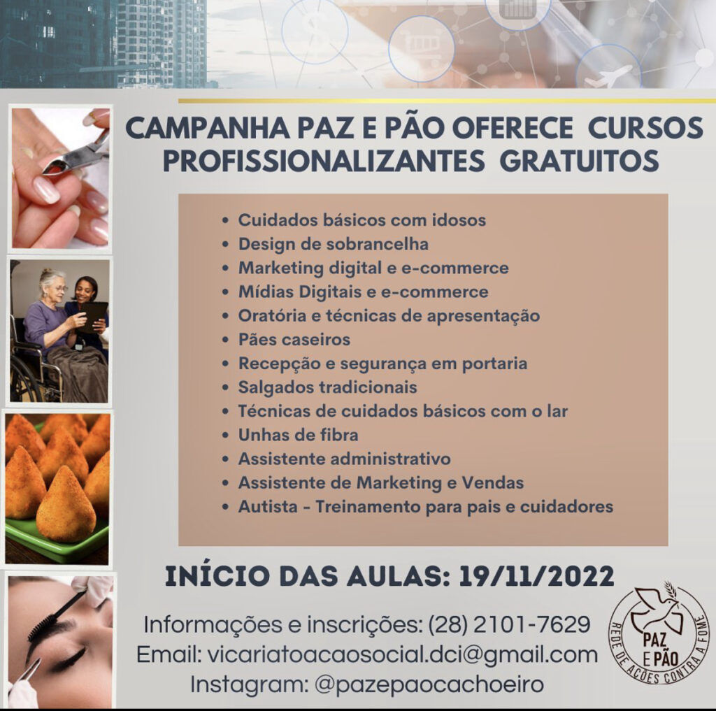 A Campanha permanente contra a Fome e pela Inclusão Social da Diocese de Cachoeiro de Itapemirim, Paz e Pão, está com inscrições abertas para treze (13) cursos oferecidos pela entidade (confira a lista abaixo).
