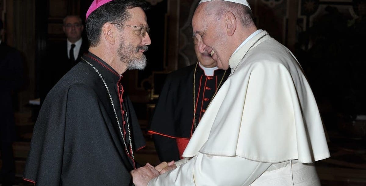 O bispo Luiz Fernando Lisboa com o Papa Francisco: “Era o acolhimento do sofrimento coletivo. Era a Igreja que os acolhia e os lembrava, não os deixando esquecidos nos conflitos fratricidas.” Foto: Direitos reservados.