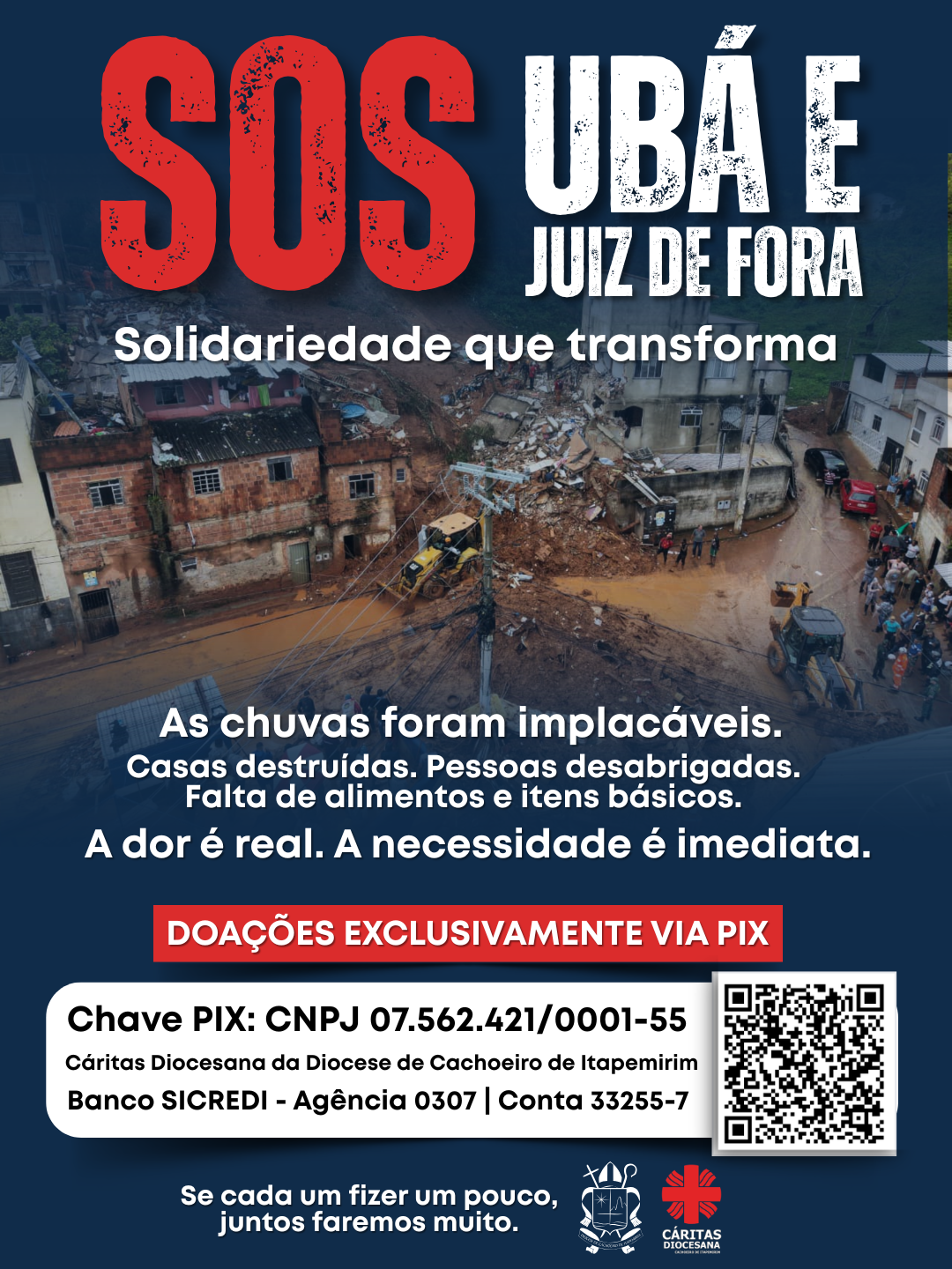 A Diocese de Cachoeiro de Itapemirim informa que todo o valor arrecadado será integralmente transferido ao Vicariato da Solidariedade da Arquidiocese de Juiz de Fora e à Diocese de Leopoldina — à qual pertence o município de Ubá —, por meio da Cáritas Diocesana de Cachoeiro de Itapemirim, garantindo que os recursos cheguem diretamente às Igrejas locais responsáveis pelo atendimento às famílias atingidas.