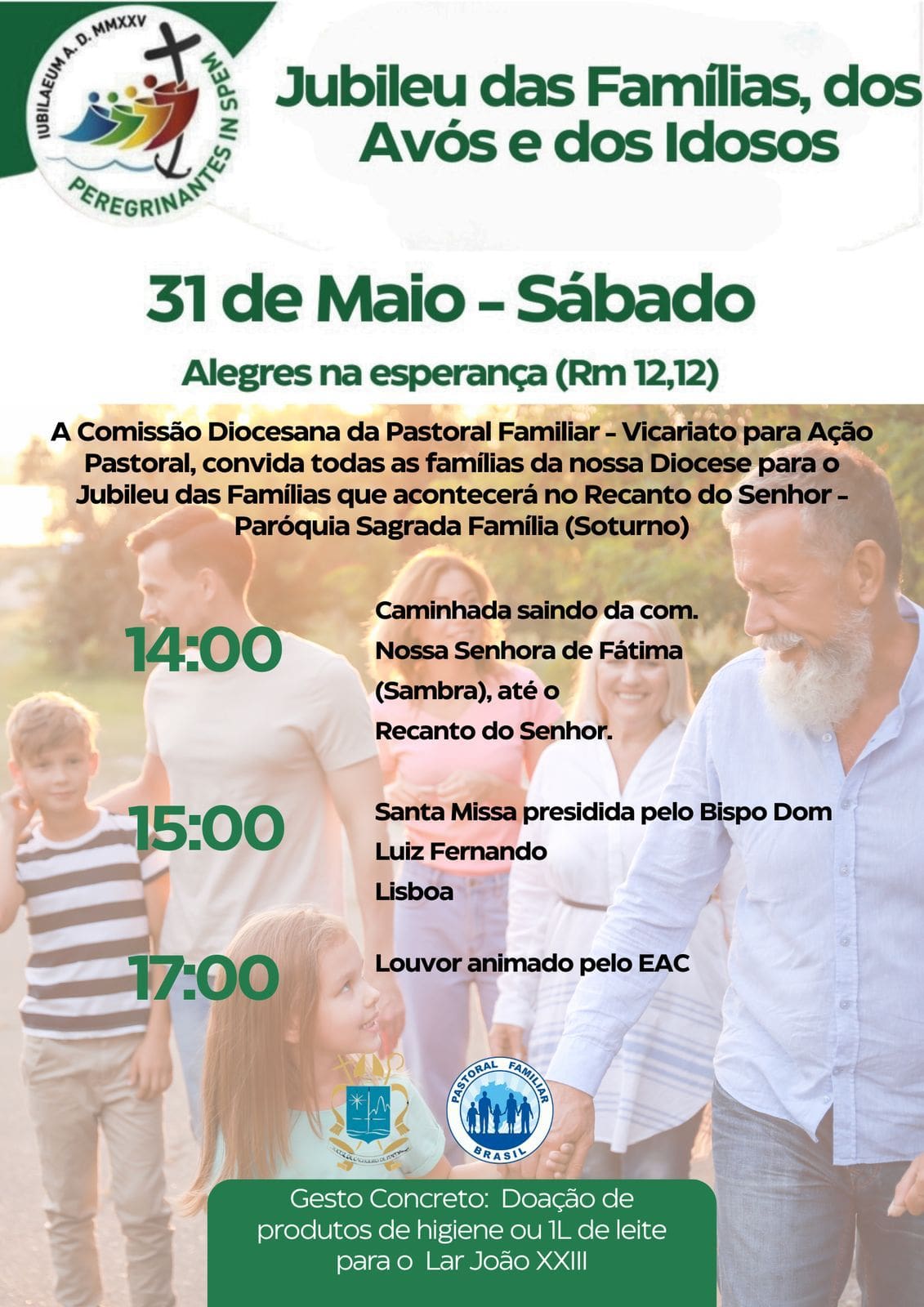 O bispo fez um convite caloroso a toda a comunidade: “Queridos membros da Pastoral Familiar, dos encontros familiares que temos na Diocese, no próximo dia 31 de maio vamos realizar o Jubileu das Famílias, dos Avós e dos Idosos. Queremos chamar todos os avós, os idosos, os casais, as famílias. Organizem-se em suas paróquias, tragam também viúvos e todos aqueles que possam se juntar a nós nesse grande momento de oração e esperança.”