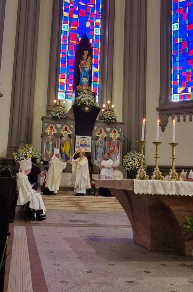 Neste sábado, 22 de fevereiro, a Arquidiocese de Vitória celebrou a Solene Celebração Eucarística para a posse de seu 5° Arcebispo Metropolitano, Sua Excelência Reverendíssima, Dom Ângelo Ademir Mezzari, RCJ. A cerimônia ocorreu na Catedral Metropolitana de Vitória e reuniu uma grande quantidade de fiéis. A cerimônia contou com a presença de 17 bispos, entre eles, Dom Luiz Fernando Lisboa, CP, representante da Diocese de Cachoeiro de Itapemirim.