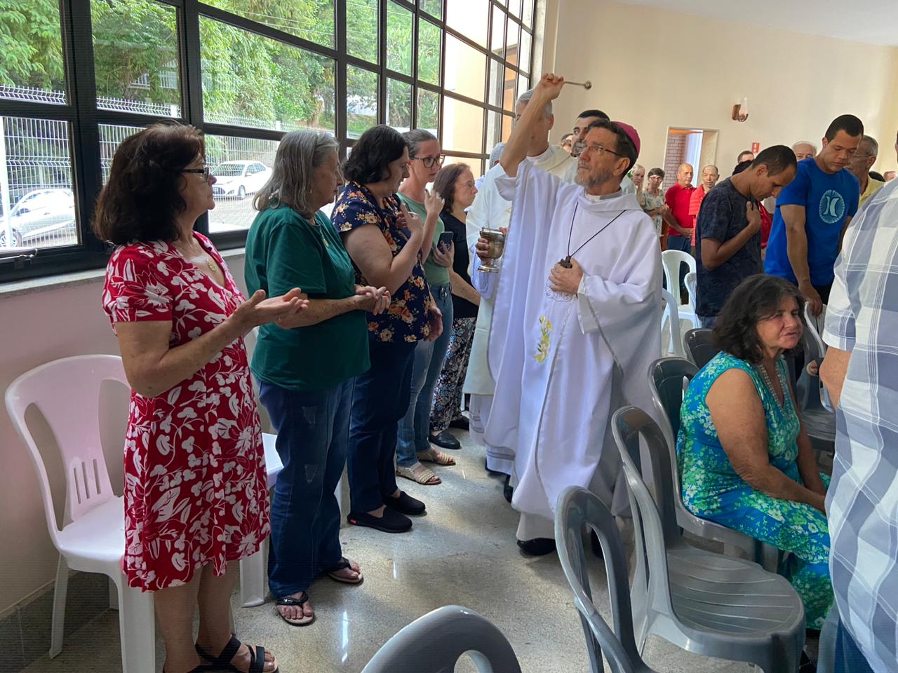 Com a presença de padres, religiosos, leigos e moradores da cidade, que lotaram a CEB, Dom Luiz Fernando, realizou, no início da cerimônia, a aspersão com água benta sobre os cristãos católicos, as paredes da igreja e o altar.