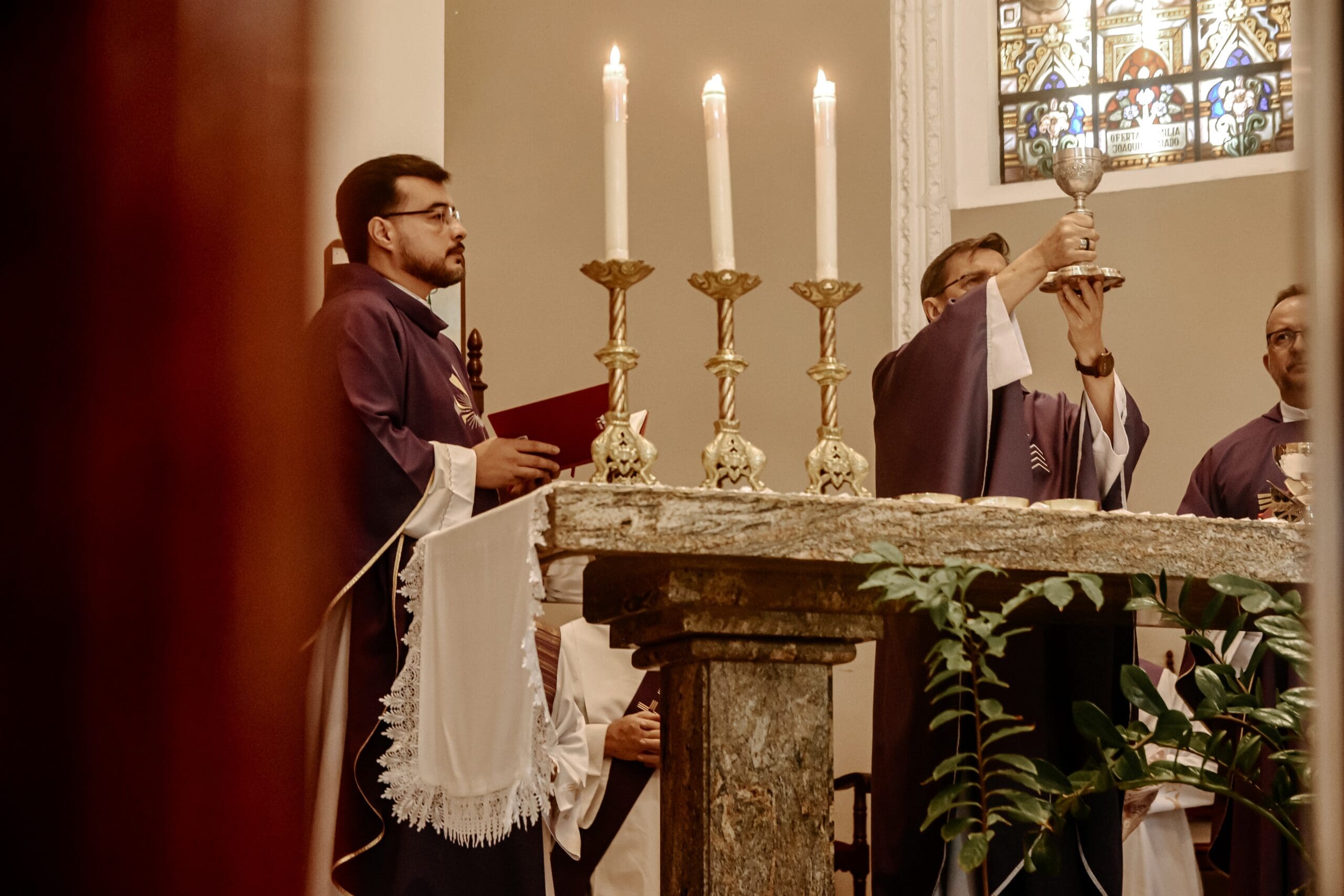 A missa começou, às 09 horas, após um momento de oração do qual participaram seminaristas, diáconos, padres e fiéis; na Catedral de São Pedro, em Cachoeiro de Itapemirim.
