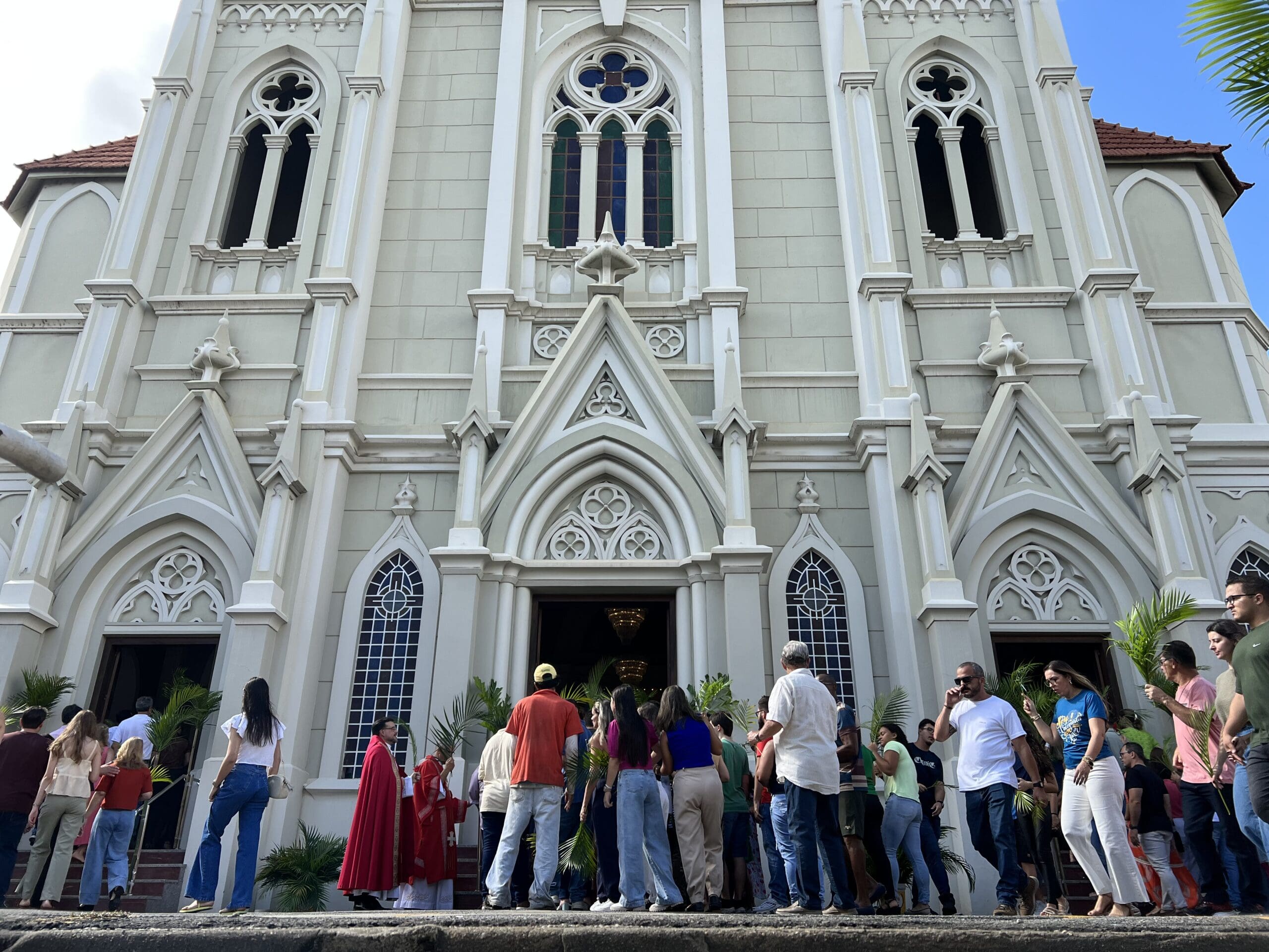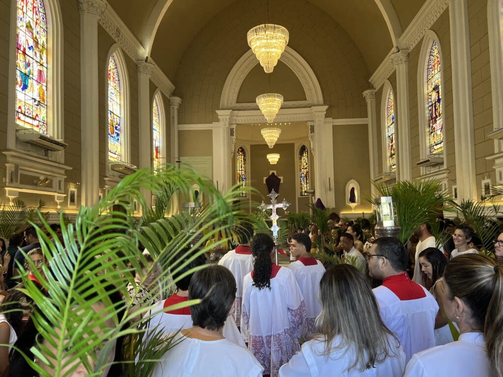 A missa do Domingo de Ramos, mais uma vez, reuniu centenas de católicos no Centro de Cachoeiro de Itapemirim. A celebração, que marca o início da Semana Santa, foi presidida pelo pároco local, Padre Bruno Sá Rangel e auxiliada pelos diáconos Reginaldo Gasparini (Naldinho) e Miguel Brunhara Jacomeli. A celebração teve início do lado externo, na Praça Jerônimo Monteiro, onde o padre Bruno realizou a benção dos Ramos, recordando que durante as cinco semanas da quaresma preparamos nosso coração para a celebração do Mistério Pascal.