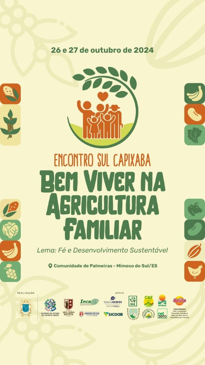 A Diocese de Cachoeiro de Itapemirim vai realizar, no dia 27 de outubro, o Encontro Sul Capixaba Bem Viver da Agricultura Familiar com o tema Fé e Desenvolvimento Sustentável. O evento acontece na comunidade de Palmeira, em Mimoso do Sul.
