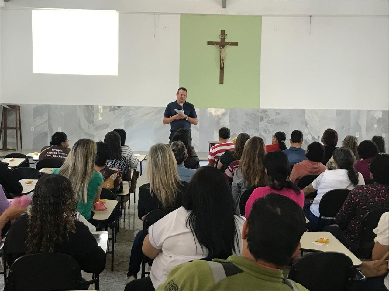 O pároco da Paróquia Nossa Senhora Auxiliadora, Pe. Claudinei Bourguignon Mascarelo (Pe. Caio) participou do encontro, dando início à formação com sua fala e uma oração acolhedora.