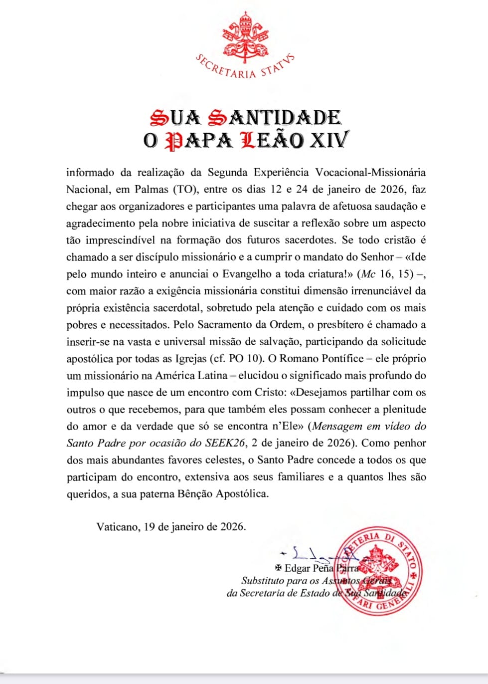 Os participantes acolhem ainda, com gratidão, a Saudação e a Bênção Apostólica do Papa Leão XIV, que renovam o ardor vocacional e fortalecem o compromisso com a evangelização.