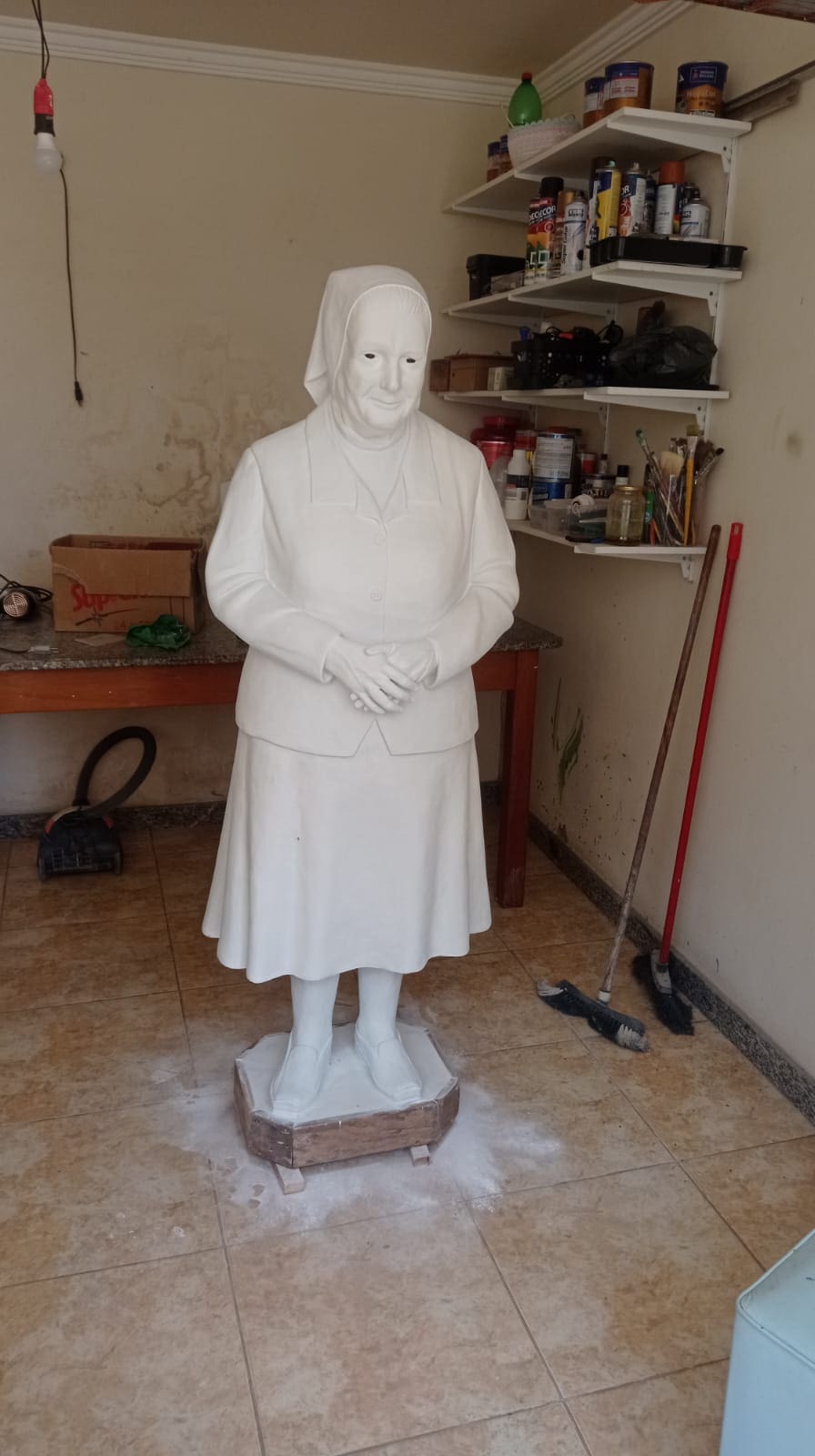 “Ouvir quem conviveu com ela foi essencial”, diz o artista, que levou cerca de três meses para concluir a obra. A escultura, feita em argamassa de cimento com olhos de vidro e base de madeira, foi pensada para lembrar uma imagem sacra, como aquelas vistas nos altares, uma reverência à vida dedicada de Irmã Vicência à igreja.