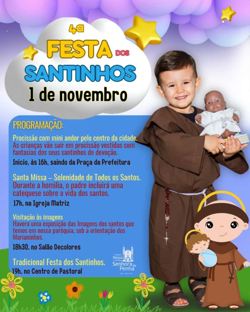 A programação inclui uma procissão pelo centro da cidade, em que as crianças, vestidas como seus santinhos de devoção, participarão levando um mini andor com a imagem de Nossa Senhora da Penha. Após a caminhada, haverá Santa Missa, catequese sobre a vida dos santos, exposição das imagens dos santos da paróquia, além de brincadeiras e muita diversão.