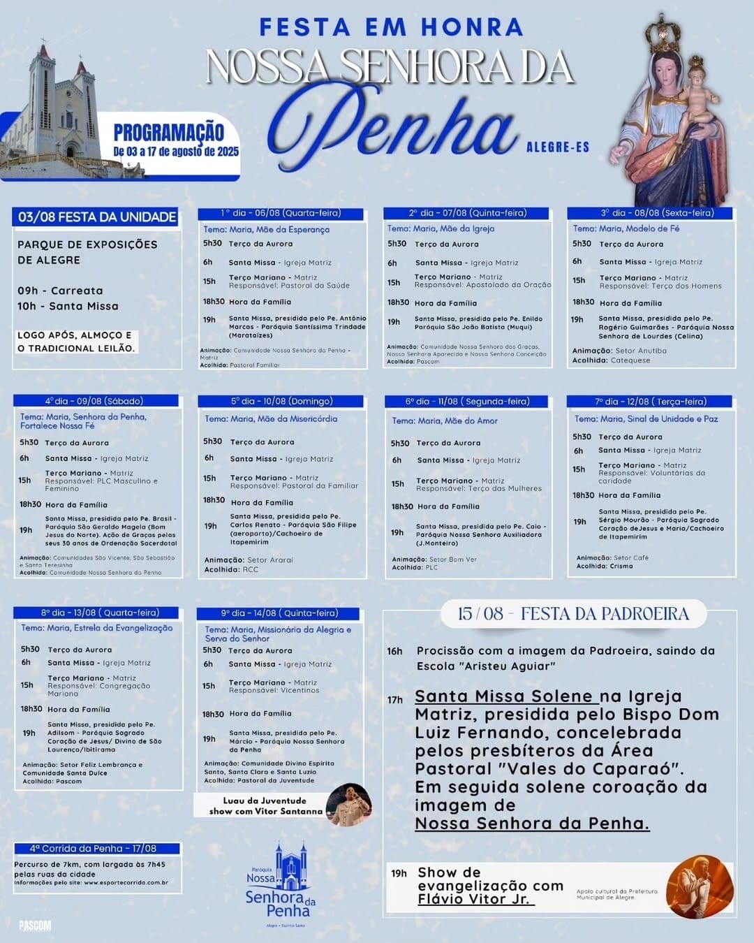 A cidade de Alegre, no sul do Espírito Santo, já respira um clima especial de espiritualidade e tradição com a realização da Festa em Honra a Nossa Senhora da Penha, padroeira do município. A Paróquia preparou uma extensa programação religiosa e cultural, que terá início no dia 03 de agosto com a tradicional Festa da Unidade e se estenderá até o dia 17.