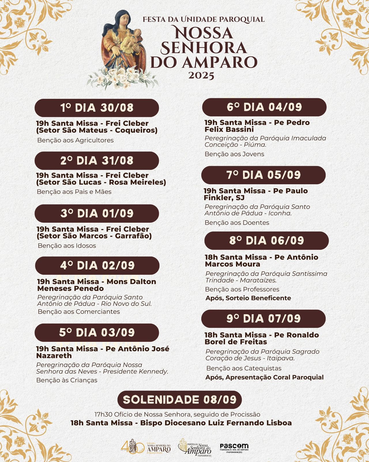A Paróquia Nossa Senhora do Amparo, em Itapemirim, se prepara para celebrar com grande devoção a Festa da Unidade Paroquial em honra a Nossa Senhora do Amparo 2025. O festejo terá início no dia 30 de agosto e seguirá até a Solenidade de 8 de setembro, reunindo fiéis de diversos setores pastorais, comunidades e paróquias vizinhas em momentos de oração, fé e confraternização.