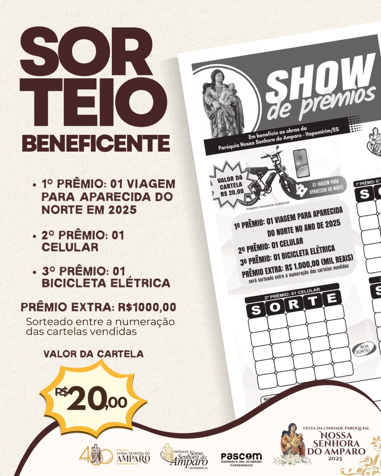 Como gesto concreto, também será realizado um sorteio beneficente, cuja renda será destinada às obras da paróquia. Entre os prêmios, destacam-se uma viagem a Aparecida do Norte em 2025, um celular, uma bicicleta elétrica e um prêmio extra em dinheiro.