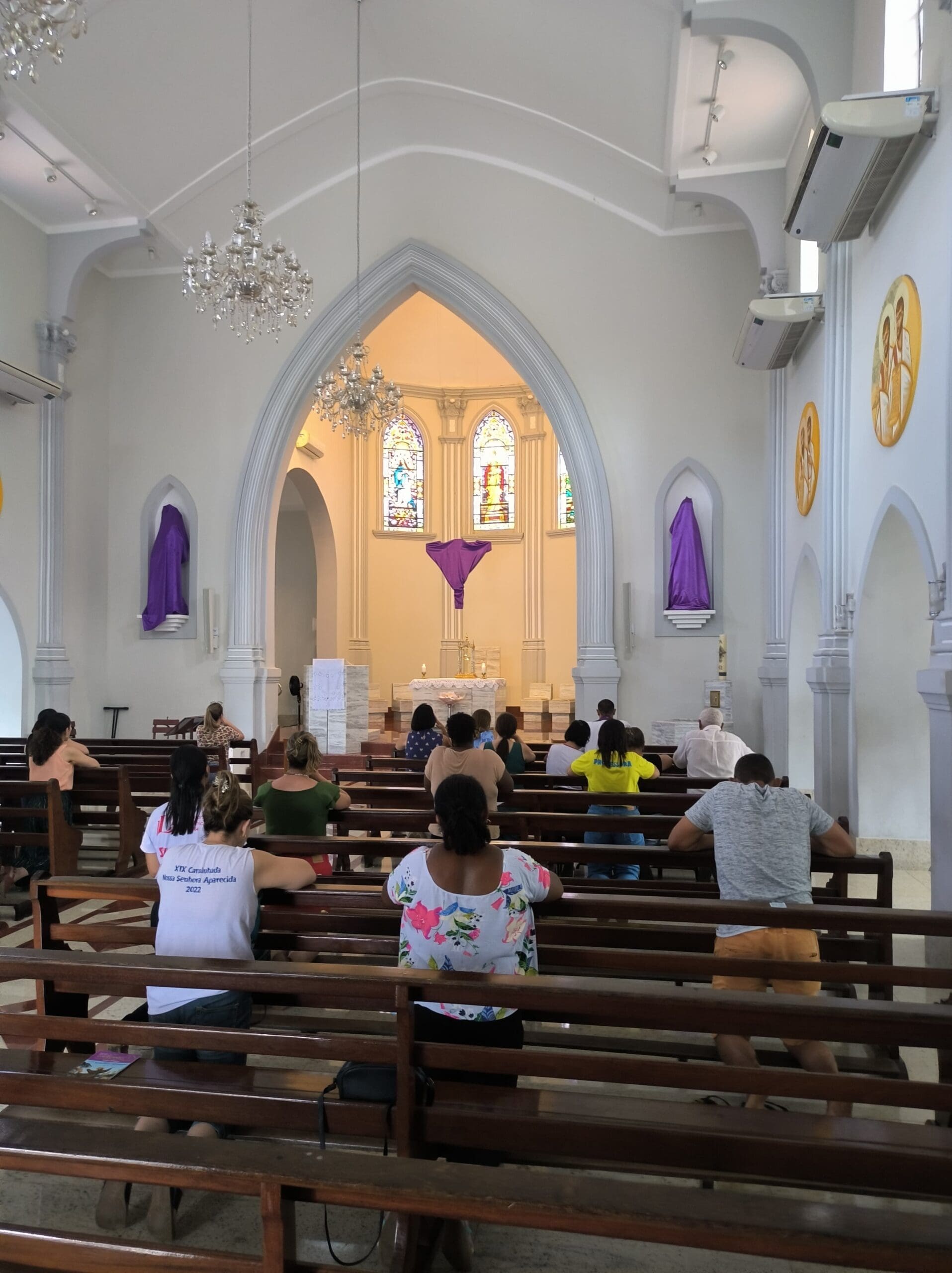 Os impactos das chuvas intensas que devastaram, em março de 2024, a cidade de Mimoso do Sul, tem deixado a população aflita nesta sexta-feira, 04 de abril. Um mapa divulgado pelo instituto de meteorologia Meteologix aponta que a cidade pode receber o maior acumulado de chuva do Espírito Santo entre o final da noite desta sexta-feira, 4, e a manhã de domingo, 6. Castigados pela última grande enchente, fiéis depositam na fé, toda sua esperança neste período de angustia. Não faltam velas acesas, terços, santinhos, além outros objetos de devoção nas mãos do povo. Povo este, formado por homens e mulheres de todas as idades que rezam e cantam unidos, fazem promessa e, nesta sexta-feira, encontram-se reunidos na Igreja Matriz São José, desde às 07 horas, para um momento de Adoração ao Santíssimo Sacramento. A súplica é pela mansidão na chuva.