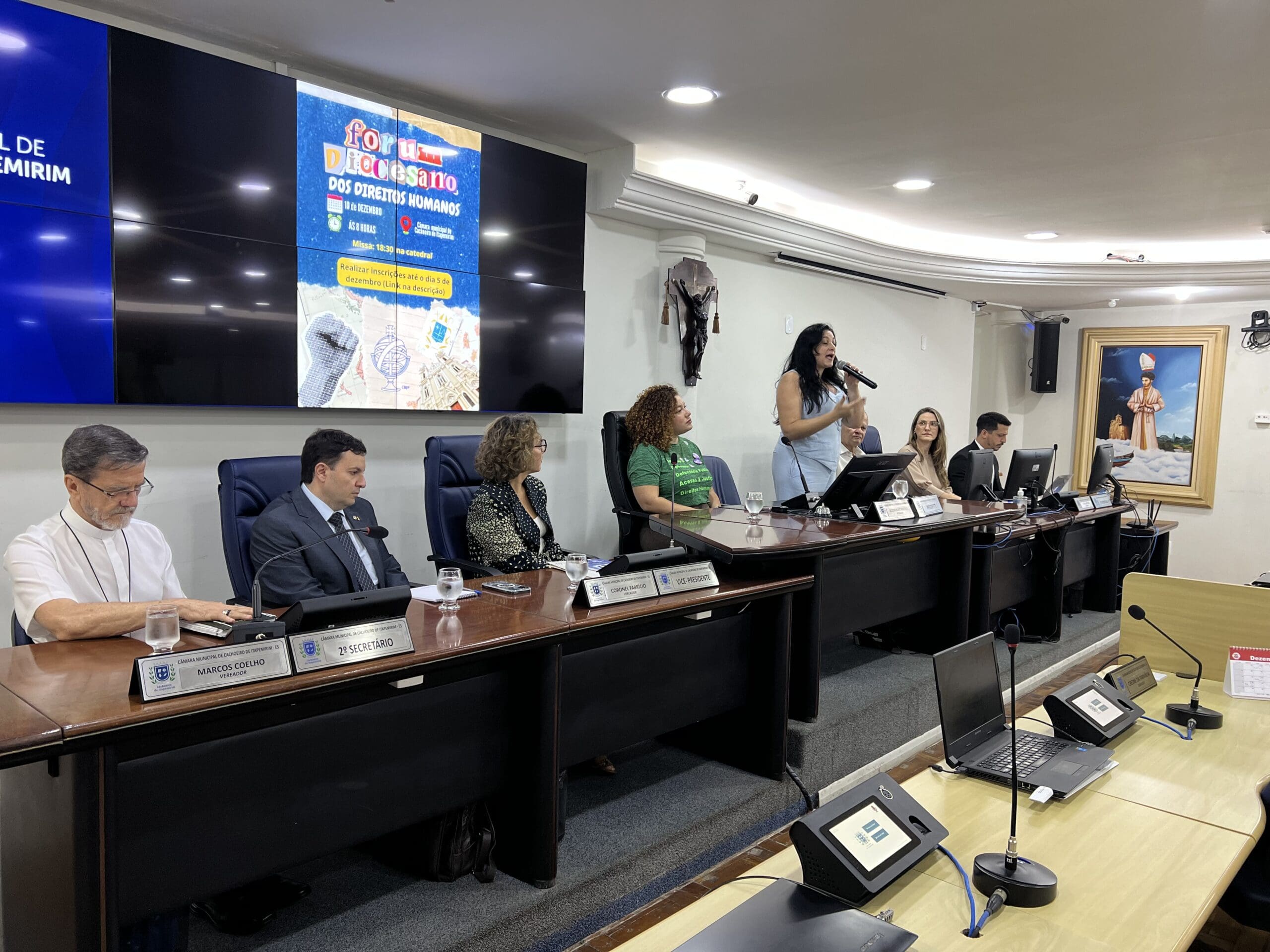 A manhã deste dia 10 de dezembro de 2025 — data em que o mundo recordava o Dia Internacional dos Direitos Humanos — ficou marcada pela realização do 1º Fórum Diocesano de Direitos Humanos, promovido pela Diocese de Cachoeiro de Itapemirim, no plenário da Câmara Municipal da cidade. O evento, que integrou a Semana Diocesana de Direitos Humanos (6 a 14 de dezembro), foi pensado como um grande espaço de escuta, aproximação, diálogo e construção coletiva entre sociedade civil, instituições públicas e lideranças comunitárias. No convite enviado aos participantes, a Diocese lembrava que o Fórum buscava “refletir sobre o impacto da presença e da ausência dos Direitos Humanos na vida cotidiana”, reunindo diversas representatividades em uma roda de conversa, e destacava que a Semana Diocesana pretendia “aprofundar a consciência sobre os Direitos Humanos como valor constitutivo do Evangelho de Jesus e da Doutrina Social da Igreja, inaugurando processos de reparação de direitos violados ou ameaçados no território diocesano”.