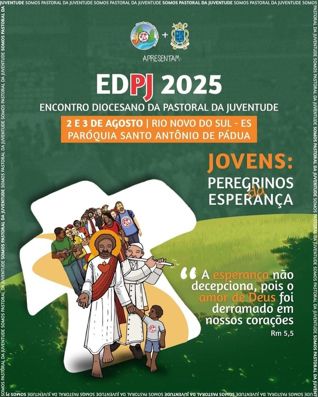 Com o tema “Jovens: Peregrinos da Esperança”, a Pastoral da Juventude (PJ) da Diocese de Cachoeiro de Itapemirim realiza entre os dias 2 e 3 de agosto, o Encontro Diocesano da Pastoral da Juventude (EDPJ 2025). O evento acontecerá na Paróquia Santo Antônio de Pádua, no município de Rio Novo do Sul,  com a proposta de fortalecer o espírito missionário e a vivência da esperança entre os jovens da diocese, promovendo momentos de espiritualidade, formação, partilha e integração.