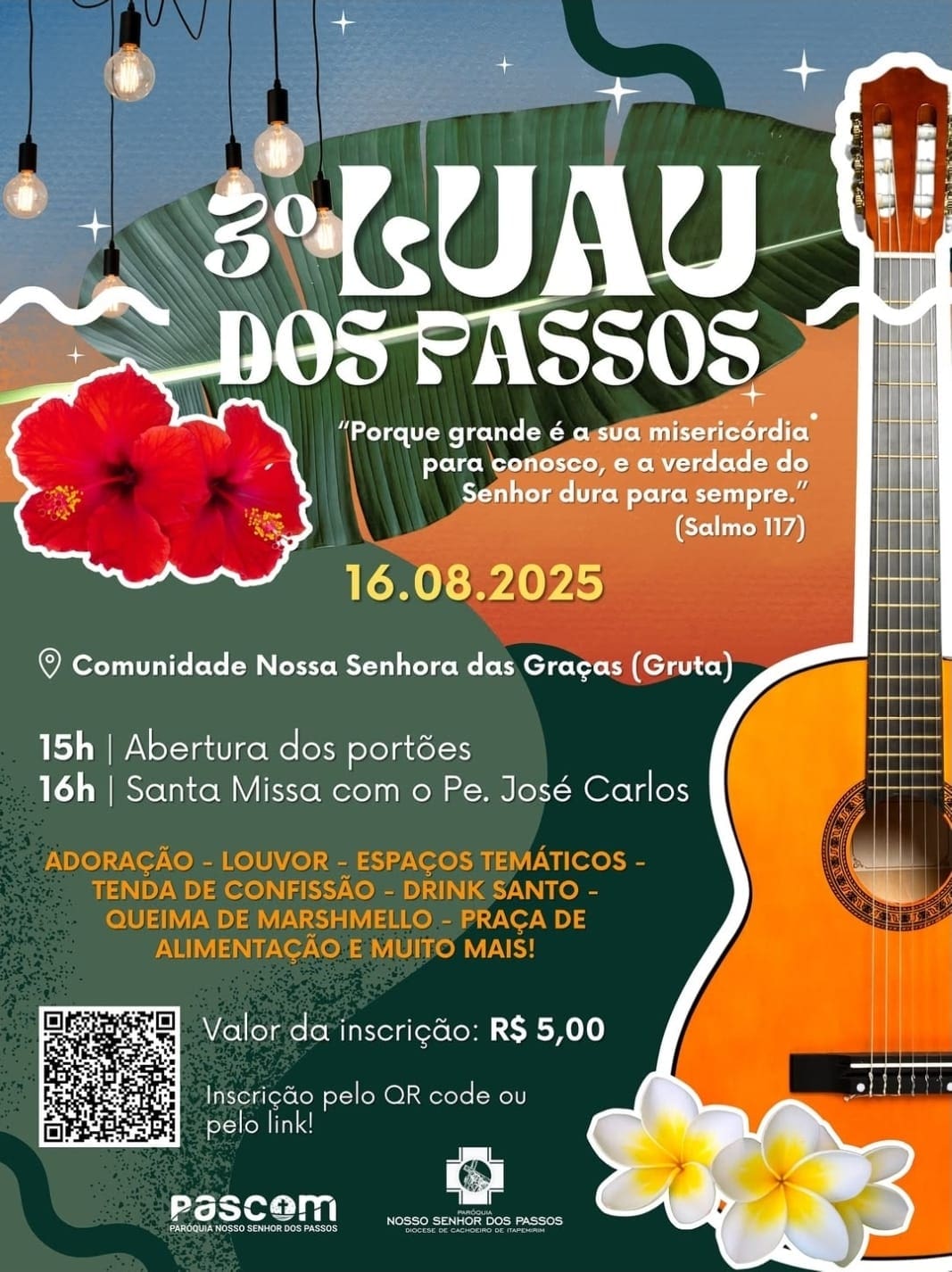A Paróquia Nosso Senhor dos Passos (Matriz Velha), de Cachoeiro de Itapemirim, está em contagem regressiva para mais uma edição do Luau dos Passos, que chega à sua 3ª edição neste sábado, 16 de agosto. O prazo para se inscrever para o tradicional evento jovem, terminará às 23h59 desta quarta-feira, 13.