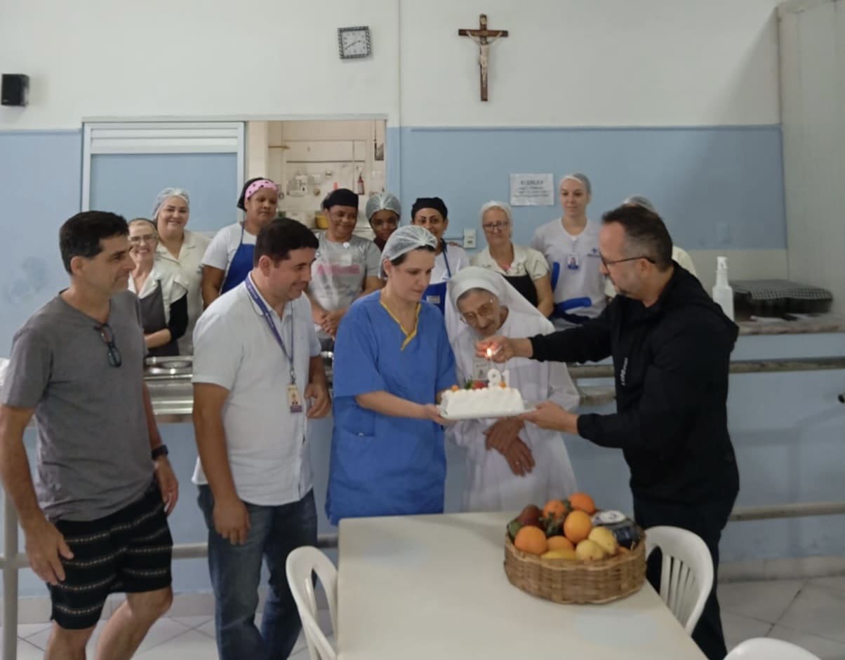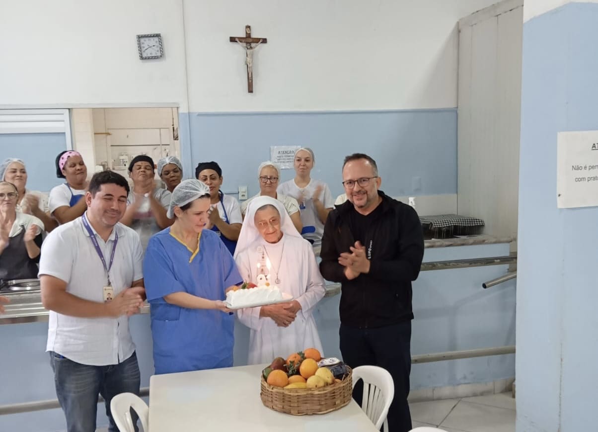 A celebração aos 91 anos foi simples. No refeitório do hospital, a freira recebeu um bolo, alguns presentes e, após um momento de oração, soprou as velinhas.