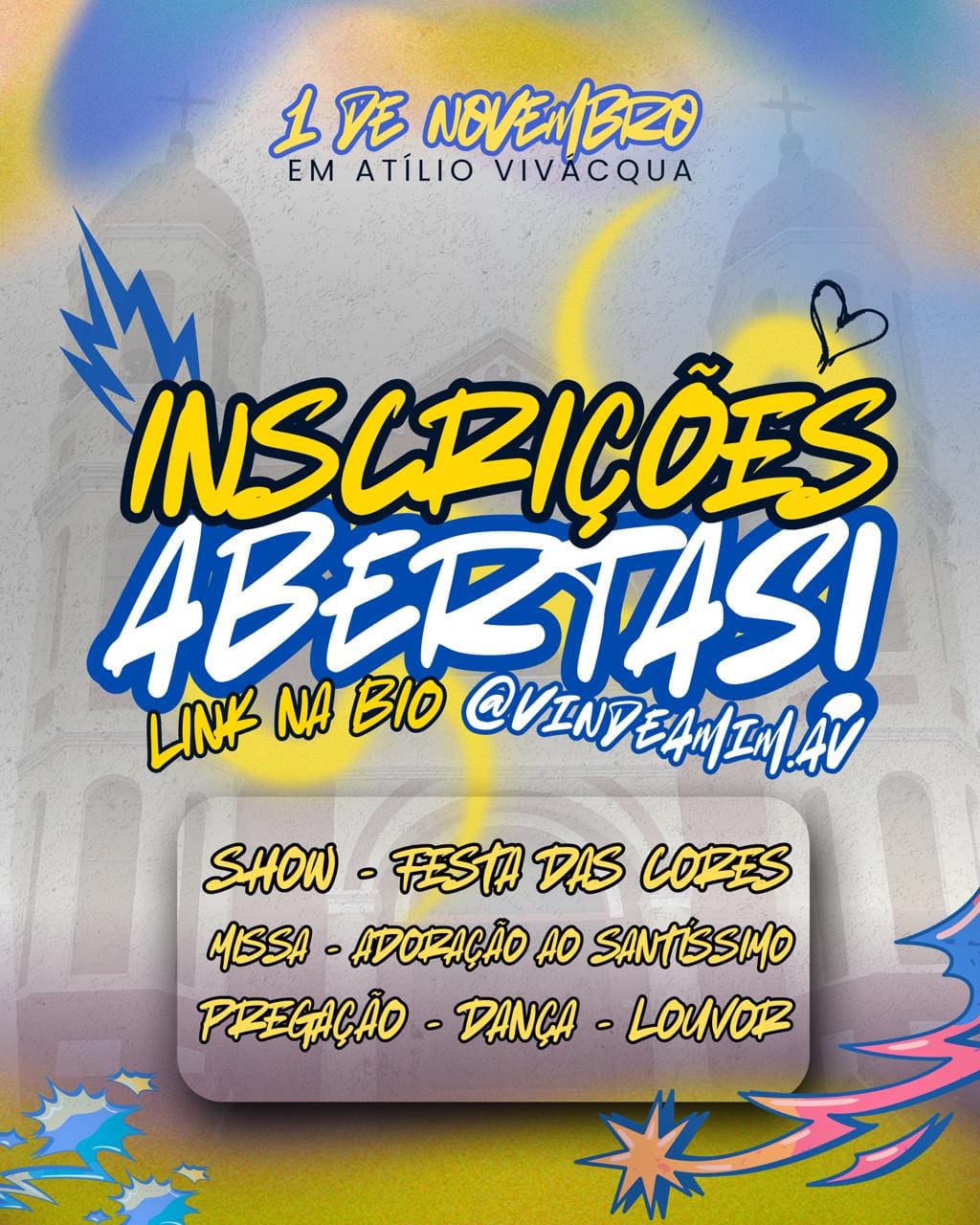 Estão abertas as inscrições para o “Vinde a Mim”, encontro que reúne jovens católicos do município de Atílio Vivácqua. Promovido pela Paróquia Santo Antônio de Pádua, o evento chega à sua terceira edição e acontecerá no dia 1º de novembro (sábado), na Igreja Matriz, com uma programação repleta de momentos de fé, alegria e convivência fraterna.
