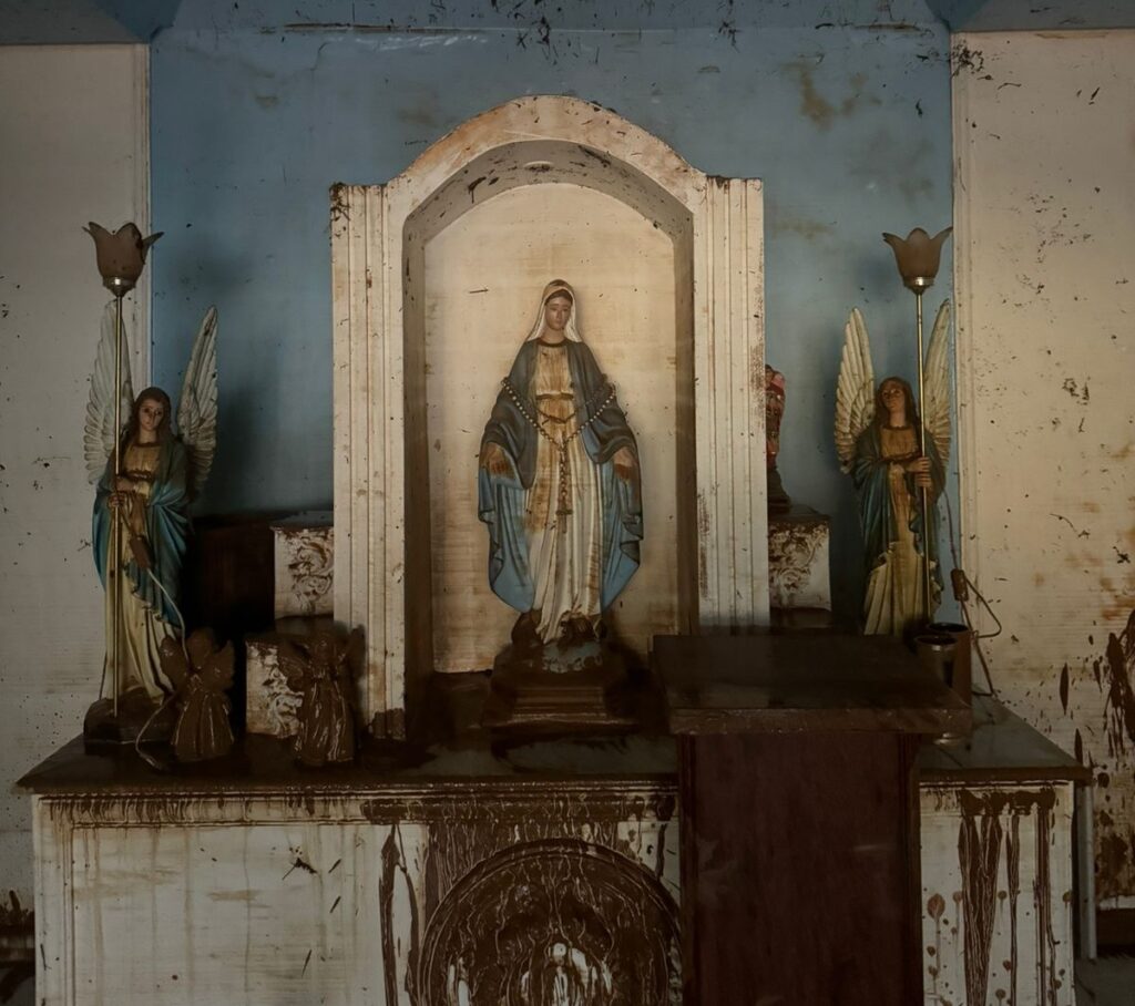 “Quero partilhar essa foto com vocês pelo seguinte: tudo foi destruído em nossa casa paroquial; tudo caiu no chão, mas a imagem de Nossa Senhora das Graças ficou intacta na mesma posição. Pra mim, é um sinal de que Maria esteve sempre de pé intercedendo por todos nós. Só gratidão!”