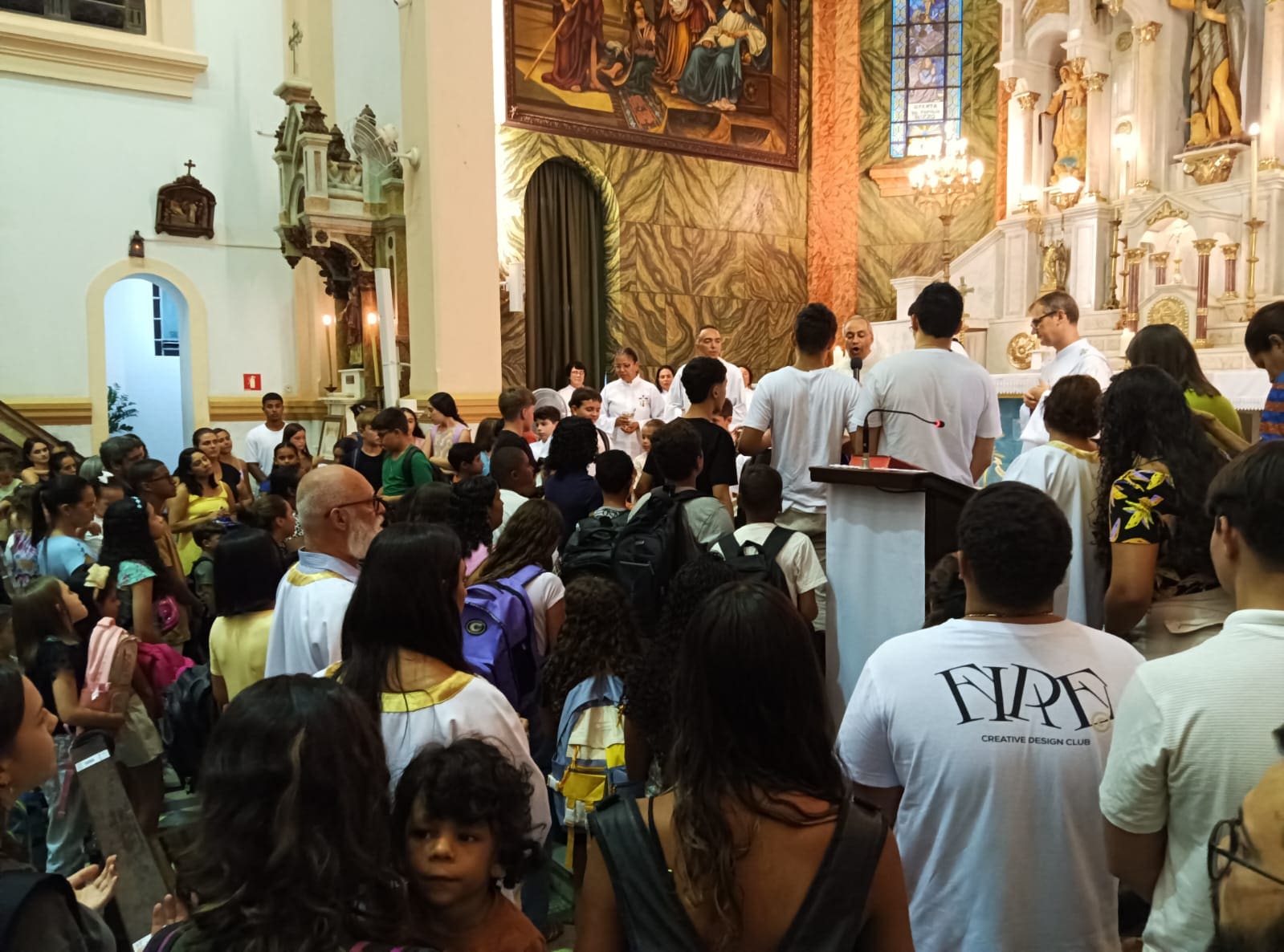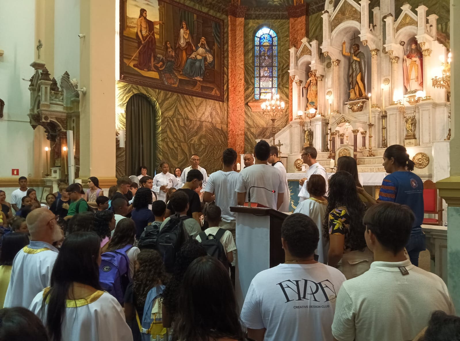 Durante a celebração, os alunos foram convidados pelo presbítero a levarem suas mochilas até o altar, onde o padre fez uma oração coletiva pedindo bênçãos para os materiais escolares e para o novo ciclo que se inicia.