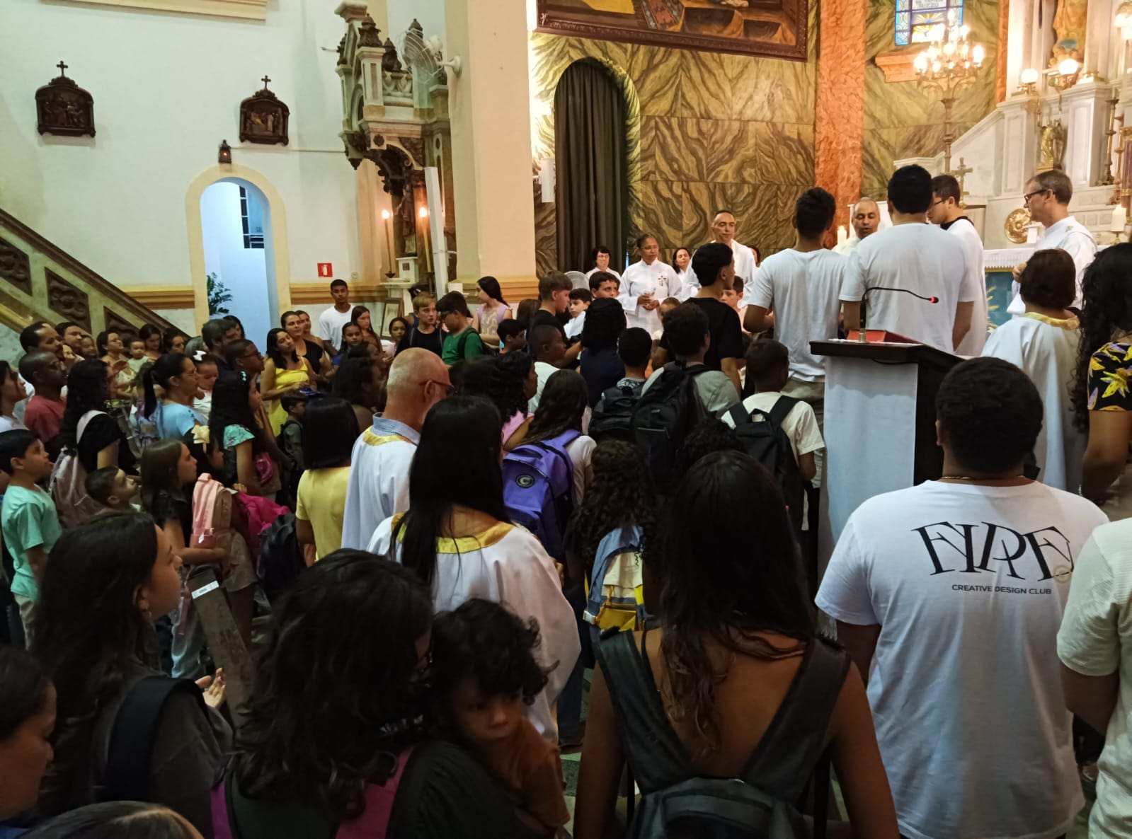 Durante a celebração, os alunos foram convidados pelo presbítero a levarem suas mochilas até o altar, onde o padre fez uma oração coletiva pedindo bênçãos para os materiais escolares e para o novo ciclo que se inicia.